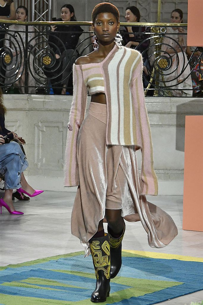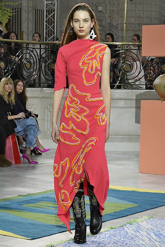Peter Pilotto以精巧絎縫和包邊細節、秘魯的民俗刺繡、毛線流蘇串聯2017秋冬新品,開場絎縫拼接的粗花呢外套... Peter Pilotto以精巧絎縫和包邊細節、秘魯的民俗刺繡、毛線流蘇串聯2017秋冬新品,開場絎縫拼接的粗花呢外套,設計師以橘色和綠色的壓車細節打造圖案式的絎縫線條,漸層的毛衣洋裝和葉形花紋的不對襯剪裁洋裝帶出女性的優雅,浮貼的立體口袋、裝飾兼拉鍊的褲面縫線、立體曲折的毛圈流蘇、古拙如遠古壁畫的針織動物圖案,則為服裝增添玩味。
