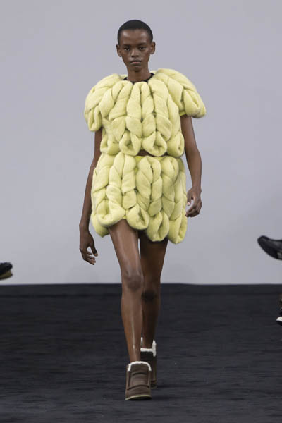 同時十分專注於材料,並玩弄紋理細節、體積和立體感,包括觸感十足的翻毛羊皮、輕盈的羽毛和毛圈紗線,創造出賞心悅目的系列。