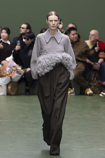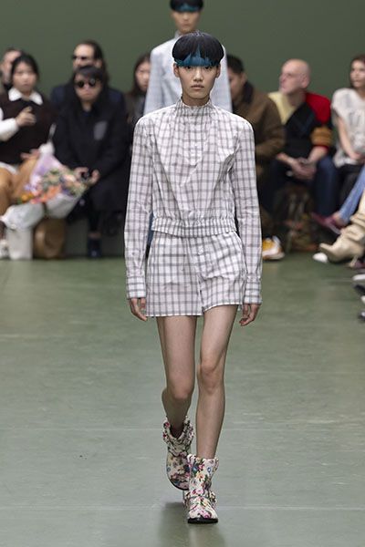 本季Jonathan Anderson除了持續玩轉各種輪廓之外,細節的處理更是引人注目,例如Albert York畫作中的老鷹、狗等動物圖案被密織在上衣及連衣裙上;玫瑰、雛菊和鬱金香等植物則在鏤空連身裙或褲子、針織套裝等單品上大肆綻放。而一款灰、黑色的連身大衣,其衣領細節採用木雕製成,更是將Jonathan Anderson對服裝富含創意力的見解以及獨創性表露的淋漓盡致。