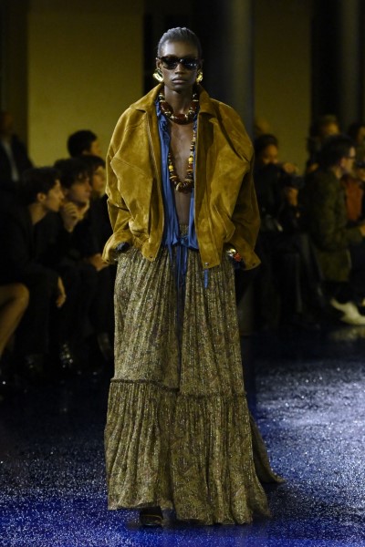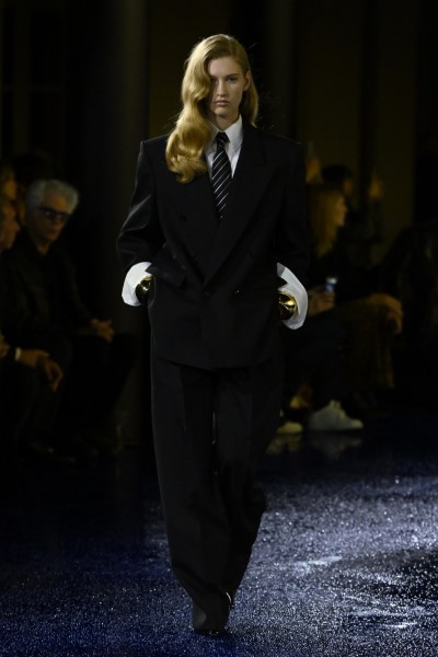 本季系列中的亮點造型非剪裁流暢的寬肩西裝和長版大衣莫屬,除了致敬Yves Saint Laurent筆下的經典Look之外,更展現出極具女性力量的美學。寬闊堅實的肩型剪裁搭配精緻的面料,造型盡顯現代摩登。此外,在華麗的裙裝系列中,服裝色彩與質感呼應了品牌創始人鍾愛的畫作風格。值得一提的是,本次秀場中的每個造型皆以品牌歷年來重要女性命名,以此向她們致敬。