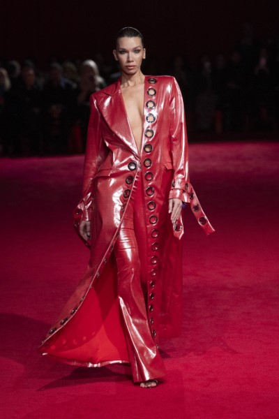 Christian Siriano亮紅色的高光澤外套與褲裝展現出未來感與80年代復古奢華交織的效果。金屬光澤斜襟和袖口裝飾的大尺寸雞眼扣帶來龐克風的意象,搭配寬肩設計,展現誇張的力量感與高調風格。