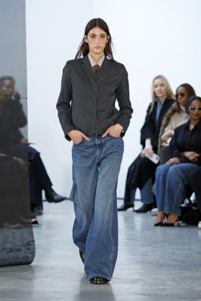 Kallmeyer結合正裝與丹寧,以復古水洗牛仔褲與修身的西裝剪裁詮釋新正裝美學。自然褪色效果的牛仔長褲具自然垂墜感與上身的羊毛西裝外套共同搭配,模糊了正式服飾與休閒服飾的界線,成為現代辦公室穿搭的關鍵風格。