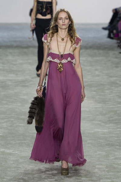 細節設計則增添更多個性化元素——人工毛草管狀裝飾、金鍊與徽章飾品、粗獷的寬版腰帶巧妙平衡浪漫與率性,進一步勾勒 Chemena Kamali 所描繪的 Chloé 女性形象:層次豐富、複雜而細膩,情感充沛且充滿獨特魅力。