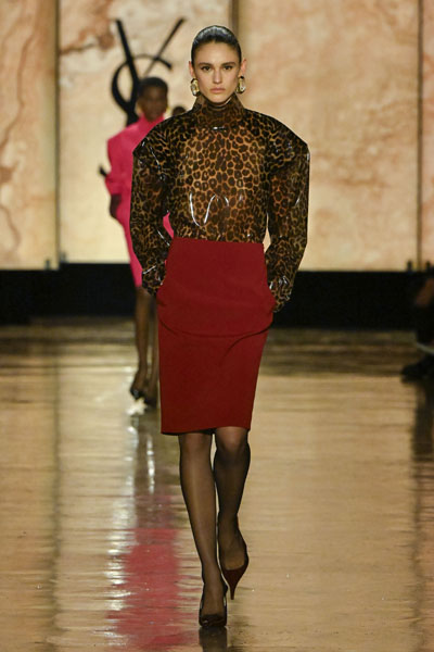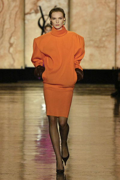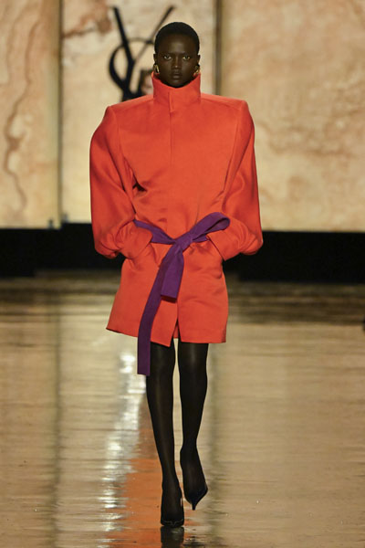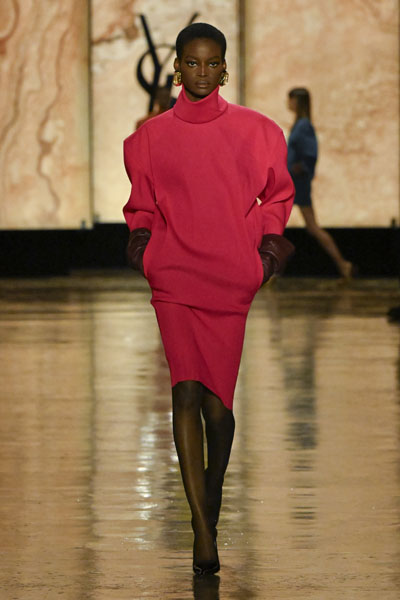 在輪廓上,本季的設計令人想起80年代Claude Montana時期的線條感,高領上衣、楔形外套與直筒洋裝,以不加墊的融合襯材打造強烈肩線,展現剛柔並濟的「時尚盔甲」形象,既有力量感又保留自由流動的韻律。石洗絲綢與皮革外套的混搭則巧妙模糊晚宴與日常界線,為高訂禮服帶來街頭氣息。