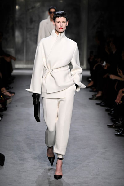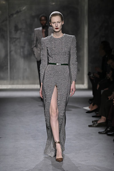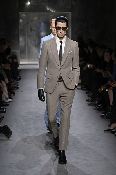 本季Tom Ford系列,由新任創意總監Haider Ackerman首度操刀,將Tom Ford本人的設計語彙以及Haider Ackerman本身的美學融匯貫穿,帶來誘惑與姿態的視覺體驗。秀場就以低調燈光、霧面鏡面與絨布座椅打造出「夜晚過後」的私密氛圍,展現低調卻深邃的奢華情感。