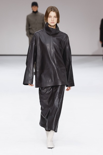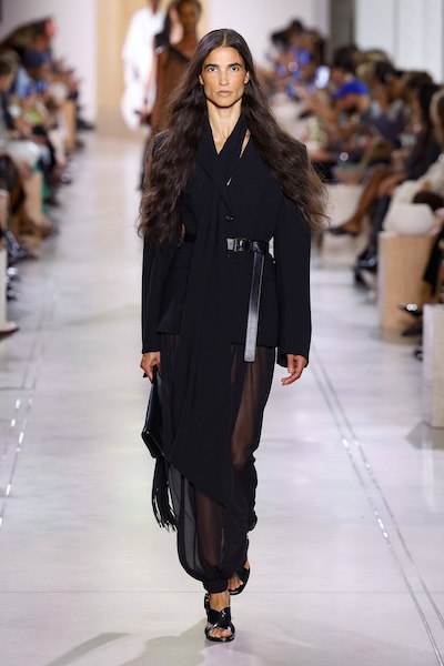 然而,在全身黑的造型中,透過布料紋理來強化細節,或者異材質的組合增添視覺變化,例如 Proenza Schouler 的皺褶西裝外套搭配平紋長裙,或 Michael Kors 將結構感上衣與輕盈薄紗裙混搭。此外,自帶光澤的材質,如皮革或緞面,也能提升整體質感。