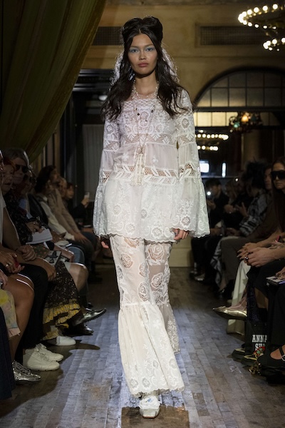 若加入蕾絲或荷葉邊元素,則更能凸顯清純柔美的女性魅力,例如 Ankvas 的荷葉波浪洋裝,或 Anna Sui 的蕾絲襯衫搭配喇叭褲。