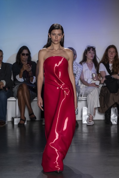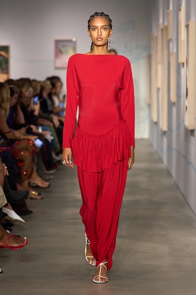 鮮豔的大紅在夏季既具視覺衝擊力,也展現出高度商業價值。無論是整套洋裝或單品運用,都能讓穿搭瞬間耀眼奪目。光澤感是其中的關鍵元素,像是 Ashlyn 的鬆弛感套裝,或 Kate Barton 的平口連身禮服,不論是隱約的光澤或強烈的高光效果,都能吸引目光、提升質感。