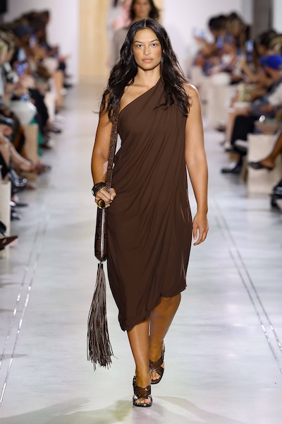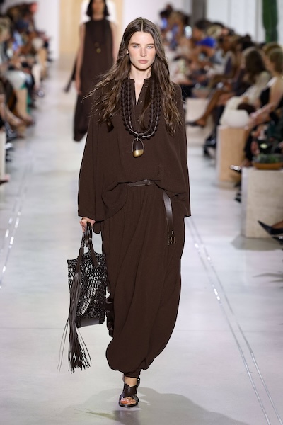 同時褐色系也更能凸顯布料紋理,無論是啞光的平織布,或帶有光澤的緞紋布料,都能展現出細膩層次。像是Grace Ling的黑咖啡套裝,以低調的光澤帶出深沈的優雅感,或 Michael Kors 的垂墜感連身裙,皆以材質語言強化褐色的深度與優雅。
