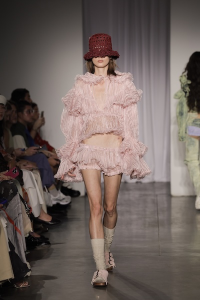 儘管粉紅色與天藍色的使用略有減少,但冰淇淋色調仍適合營造浪漫氛圍。Private Policy 的抽皺粉紅上衣搭配粉藍色荷葉邊短裙,彷彿在不安的經濟氛圍中創造美好夢境。