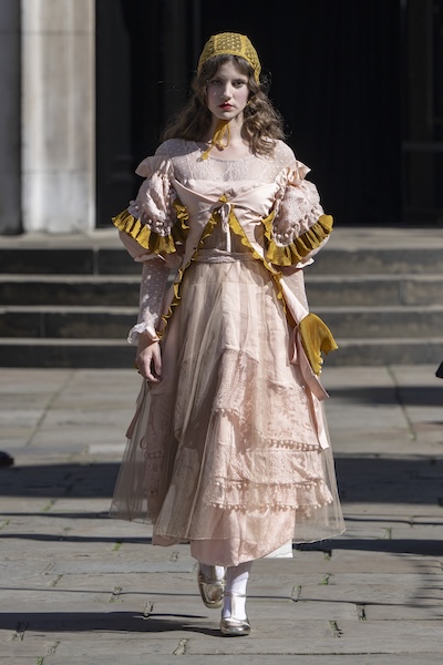倫敦設計師以繁複細節重新詮釋女性的浪漫氣質。蕾絲、堆疊薄紗、誇張下擺、荷葉邊與泡泡袖共同建構出柔美輪廓,並搭配粉彩色系,展現出輕盈又夢幻的浪漫氛圍。Bora Aksu 的系列可謂代表,以多層蕾絲與荷葉邊堆疊出童話般的甜美浪漫;Erdem 與 Dreaming Eli 則透過貼合身形的剪裁與局部裝飾,描繪出屬於當代女性的多重柔美姿態。