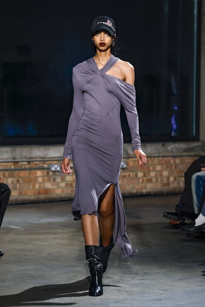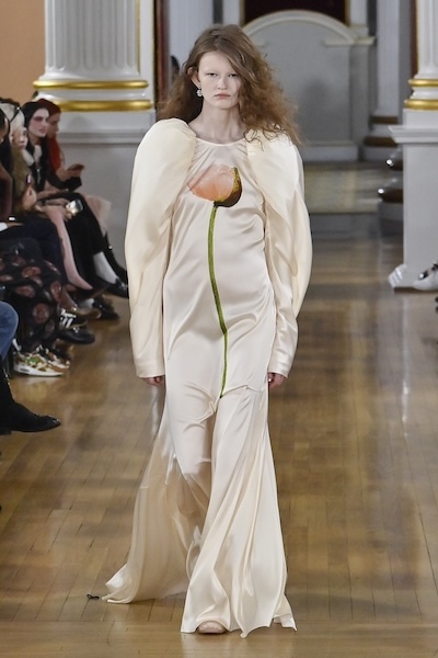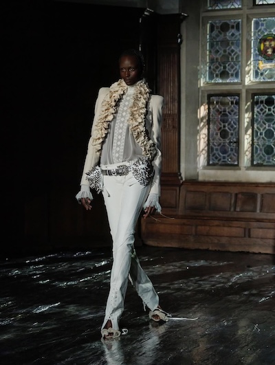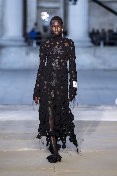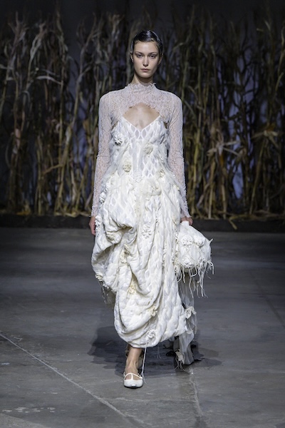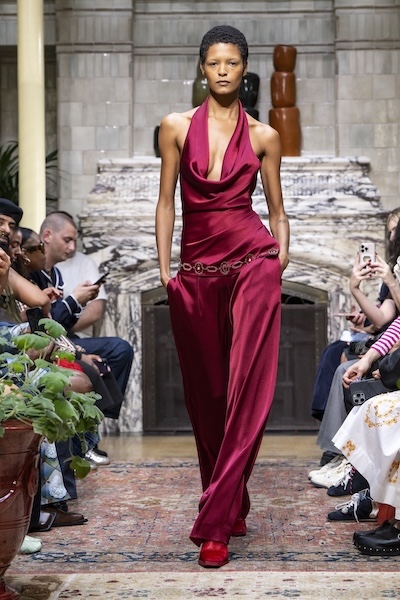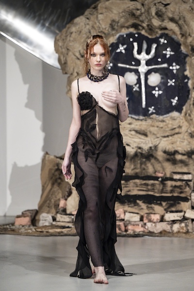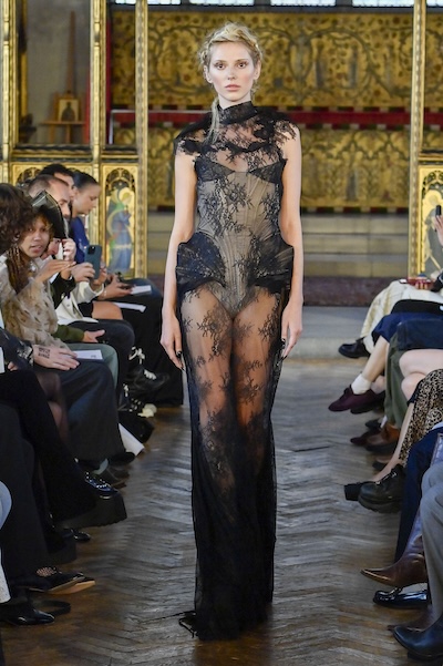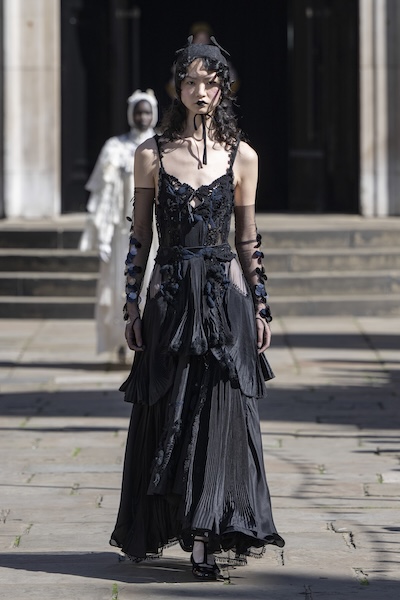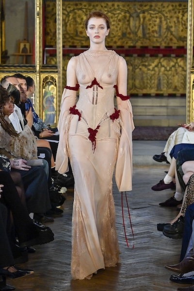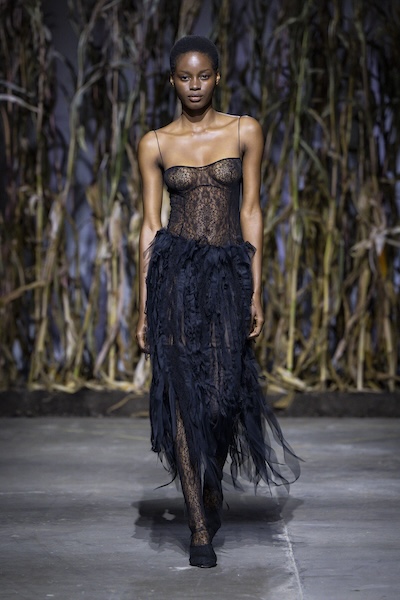 層層薄紗、自然波浪與略顯隨性的剪裁,共同構築出暗黑浪漫的氛圍。Pauline Dujancourt 以緊身蕾絲馬甲與絲帶狀薄紗裙展現破碎之美;精緻的蕾絲與貼花細節則增添了奢華氣息,勾勒出如同哥德詩篇般的神秘女性形象。Patrick McDowell 則在紅色花卉印花外覆以黑色薄紗,營造若隱若現的朦朧層次,讓浪漫多了幾分深沉與張力。