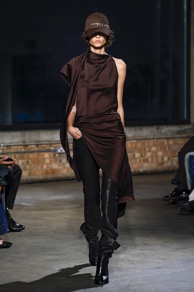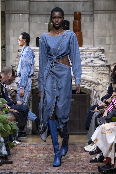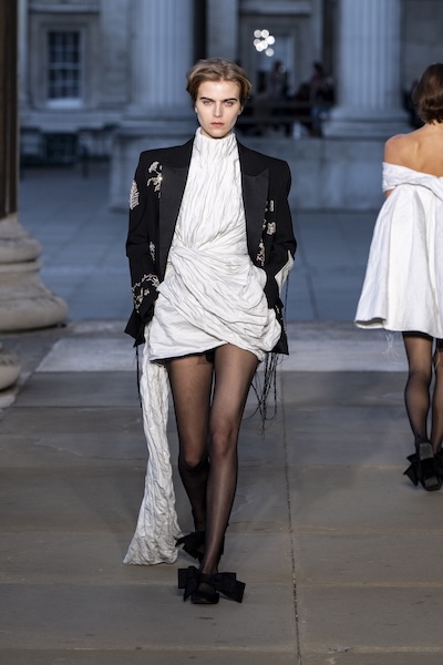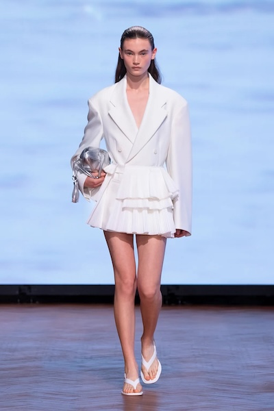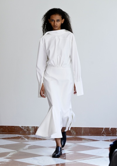 以扭轉、打褶、交疊等細節為經典辦公正裝注入新意,搭配清爽白色,為職場穿搭帶來實用與時髦兼具的設計平衡。例如Tove 的扭結西裝或是Emilia Wickstead的反面正穿襯衫,在結構中加入設計巧思,展現理性中的微妙變化。另外如Aaron Esh或Ahluwalia的連身洋裝,利用布料自然垂墜的交錯打結,增添層次感與流動性。
