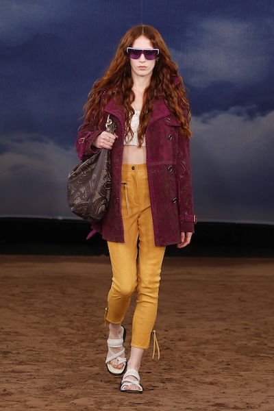 不同於紐約的輕鬆實穿風,倫敦的 2010 復古更帶著英式搖滾與街頭精神。例如Burberry 以暖黃色緊身褲搭配酒紅外套與側背大包,展現當代年輕人特有的叛逆青春感。低腰短裙與刷淡藍色緊身牛仔褲則重現當年風靡大街小巷的輪廓樣貌。