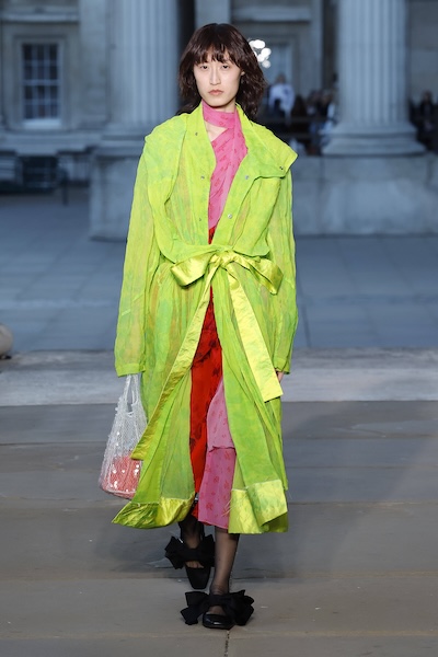 英式時尚的代表單品風衣,以輕盈材質與亮眼色彩為經典注入新意,更適合春夏穿著。Erdem 的螢光緞面與印花設計令人眼前一亮,帶出浪漫與活力兼具的氣息;而 Burberry 則以流蘇與花紋為經典風衣增添玩味年輕感。短版設計如 Rory William Docherty 與 Toga 的款式,更為季節過渡提供實穿選擇。
