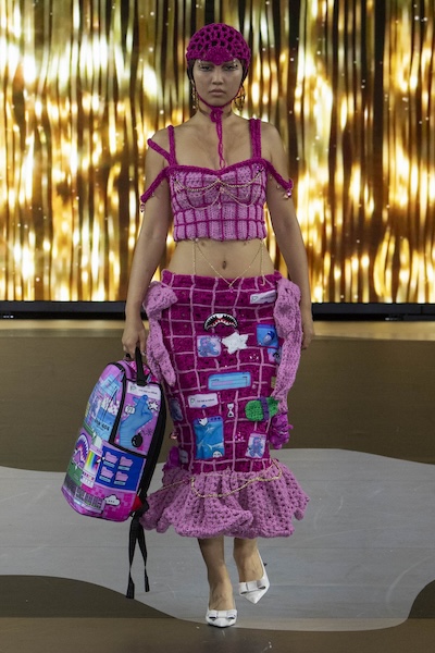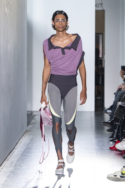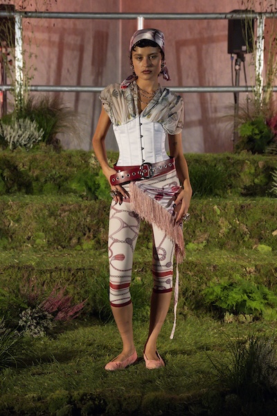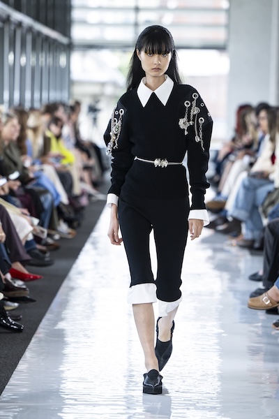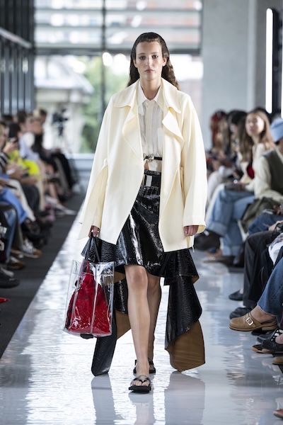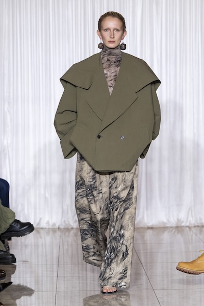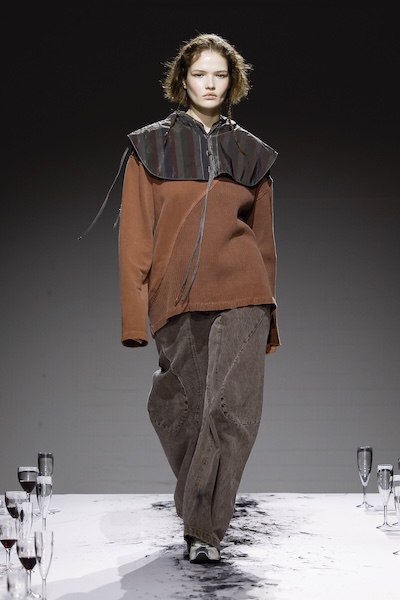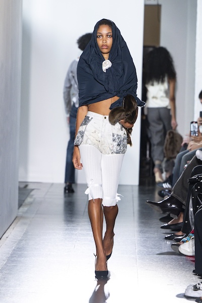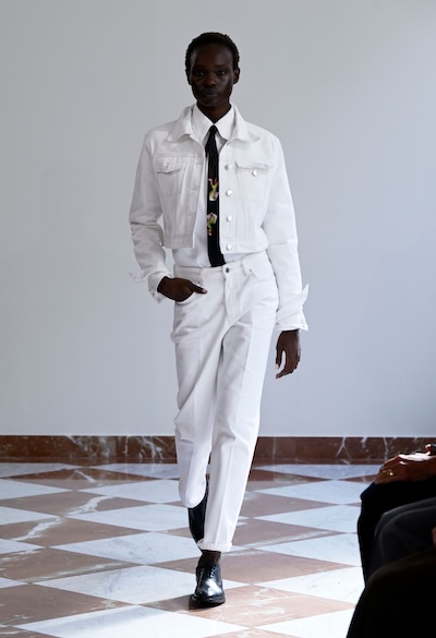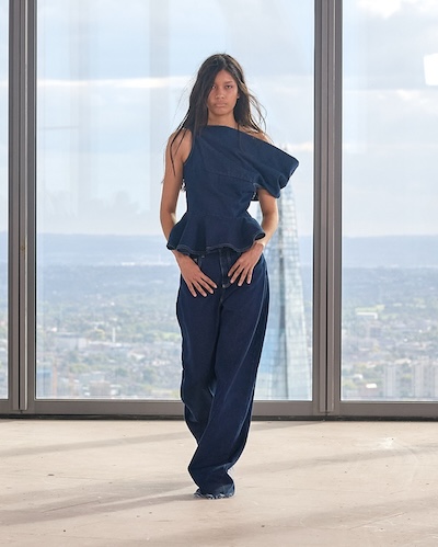 Emilia Wickstead 與 Ahluwalia 的全套牛仔造型,以短版外套搭配直筒牛仔褲,有著2010年代復古感;寬鬆牛仔褲依舊是市場寵兒,Lueder 以超大口袋拼接細節增添街頭感;而緊身煙囪褲與直筒褲也悄然回歸,Kseniaschnaider 透過縫線剪接為經典丹寧注入現代輪廓。