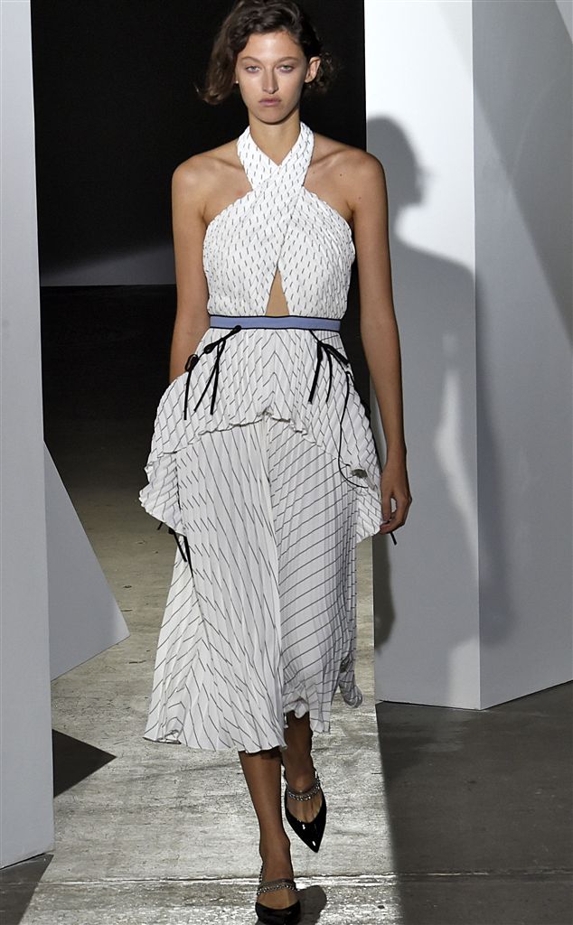 2017出現的細條紋潮流,延續至2018春夏秀場,以白底藍細條或藍底白細條為主。譬如Jill Stuart和3.1 Phillip Lim使用直條紋於經典款式,藉由腰帶或胸部線條,勾勒女性曲線;Rosie Assoulin及Jason Wu則運用版型變化,更新輪廓;還有Gabriela Hearst利用裁減變化線條方向、Self Portrait結合條紋與壓褶,展現細條紋的動感時尚