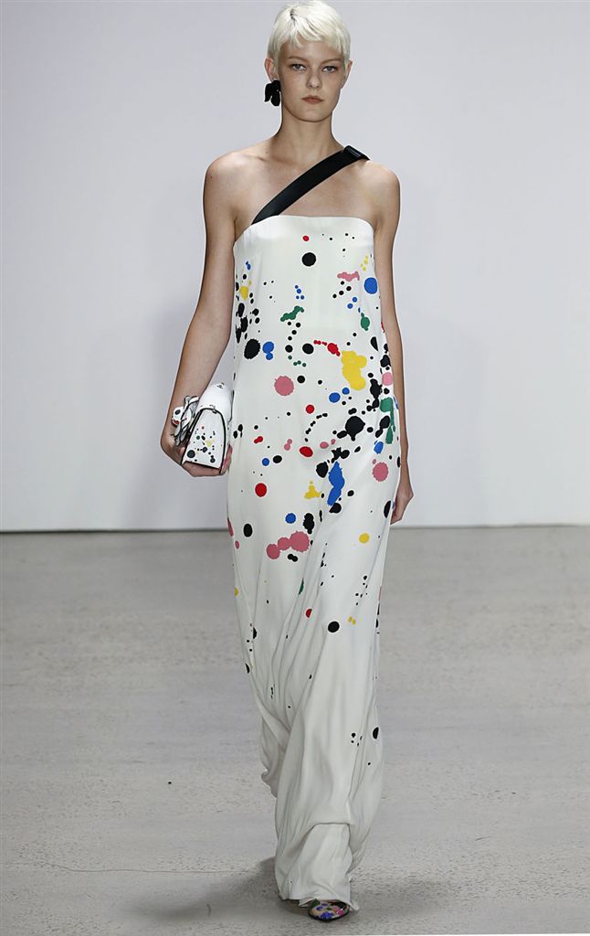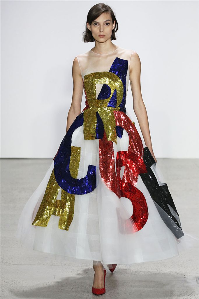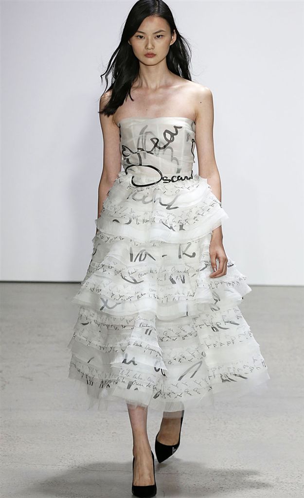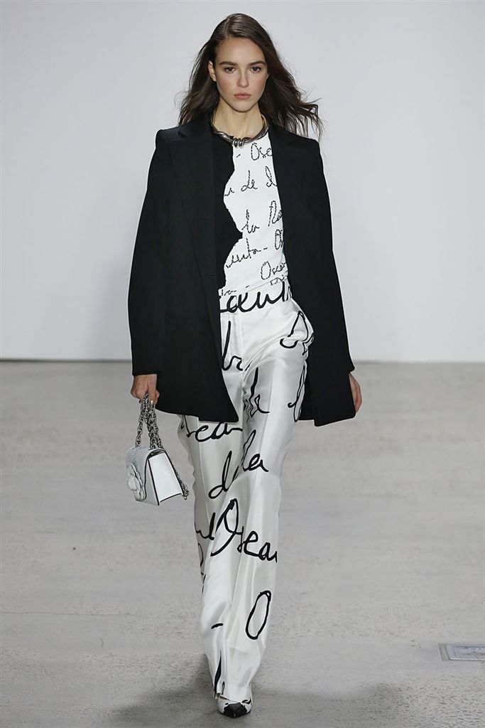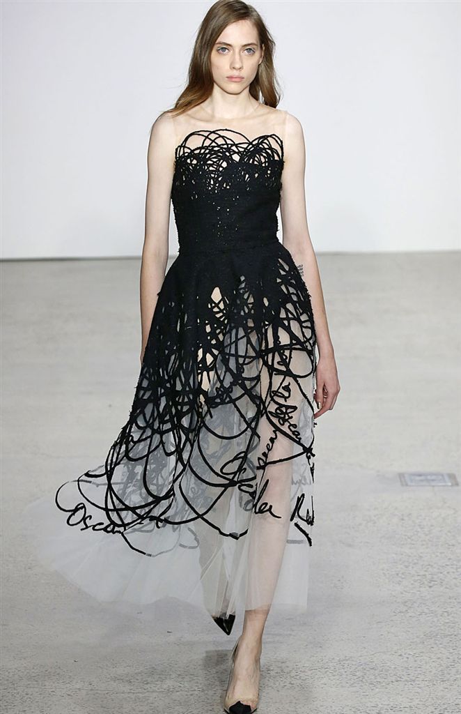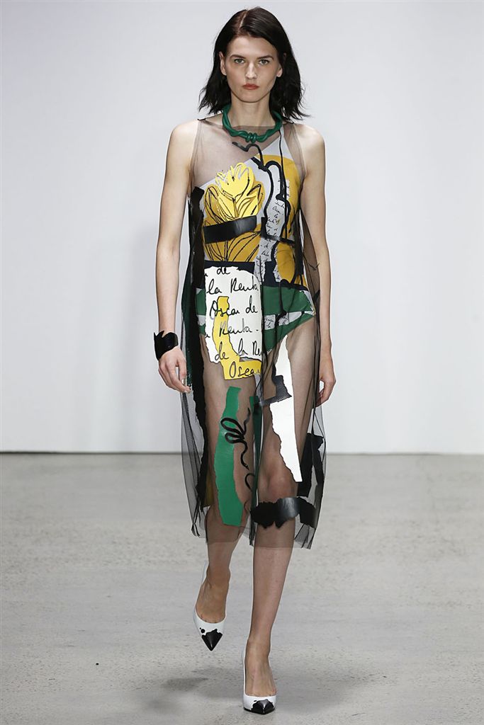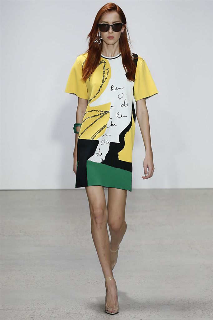 2018春夏系列除了仍有品牌擅長的禮服廓形(包括薄紗透視洋裝、扭轉腰身的網紗禮服),設計師並藉由Pop Art和一封來自De la Renta的書信進一步衍伸,將手寫文字大面積地印在衣服上,並搭配飽和色塊、彩色亮片、繽紛的噴漆墨點印花等設計,走向更年輕化的風格。