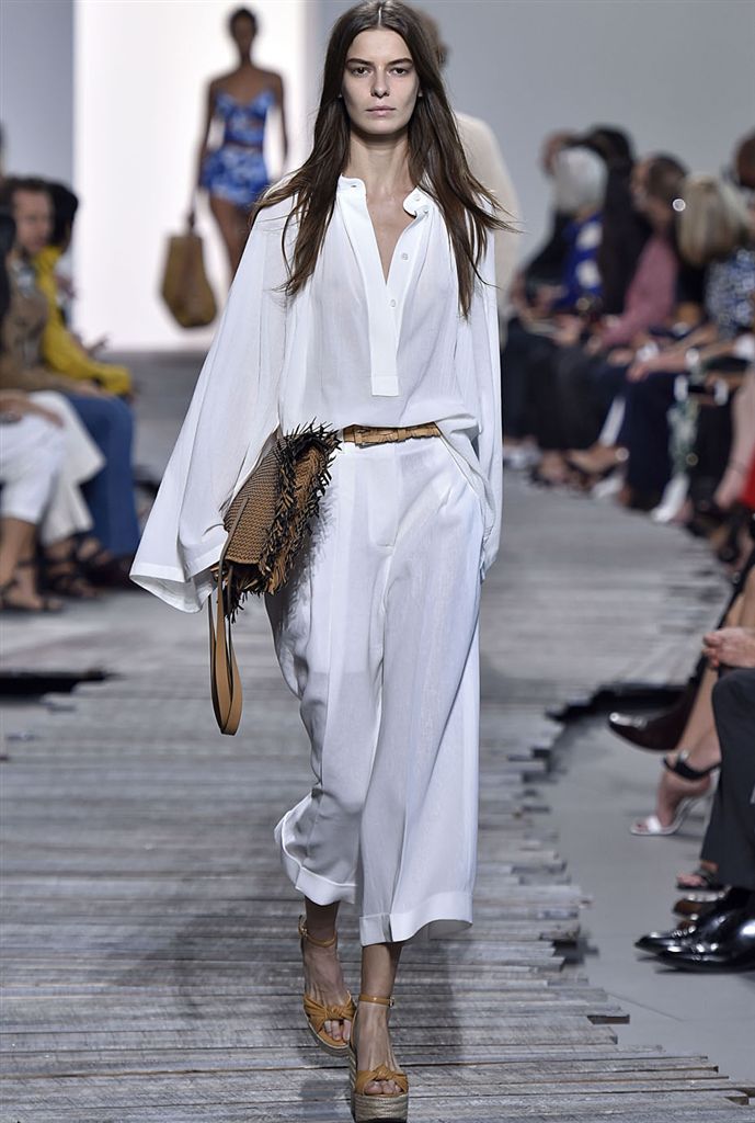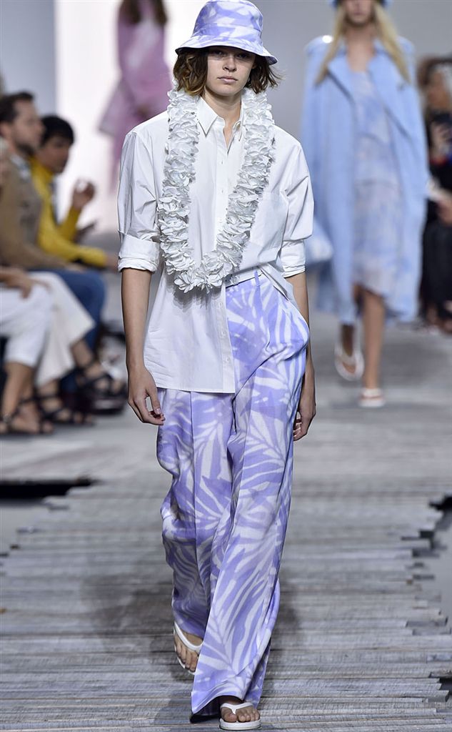 棕櫚葉印花、渲染設計、亞麻材質、藤編包、百慕達短褲等度假元素,融入寬大的西裝、純白襯衫、卡其風衣、套頭針織衫、裹身連衣裙、條紋長褲之中。色彩清新柔淡,薔薇、紫藤、矢車菊與海洋藍,與中性的沙色、珍珠和煙灰交織。