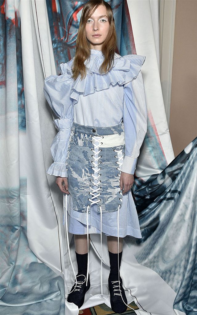 丹寧布的可塑性成為設計師向來喜愛運用的面料之一,尤其在春夏更可呈現出前衛不羈的個人魅力。2018春夏倫敦設計師以丹寧布搭配上不對稱的剪裁、可拆卸的衣袖、補丁等打造出獨一無二的率性風格,而像是Haizhen Wang的綁帶拼接或Osman的拉鏈開叉等,也都增添了細節變化。