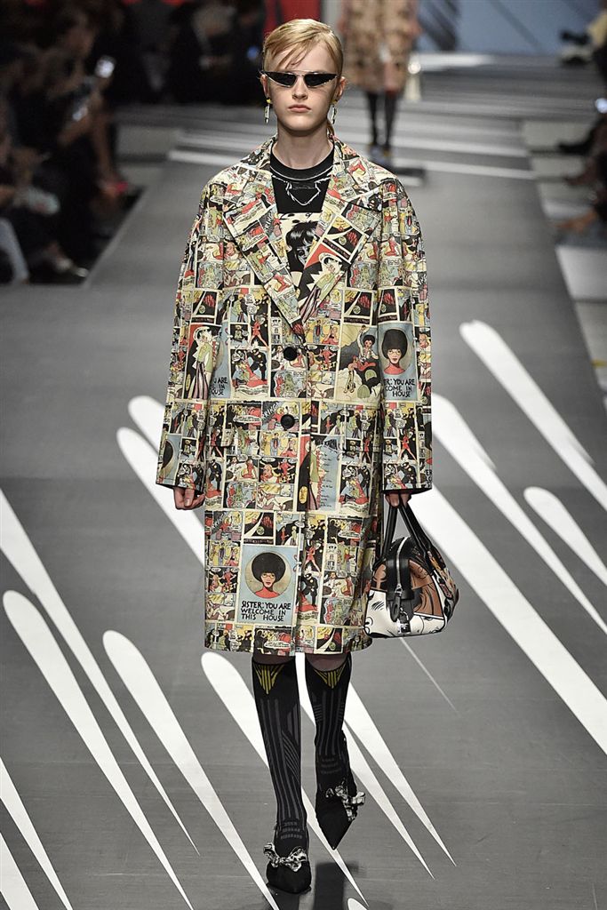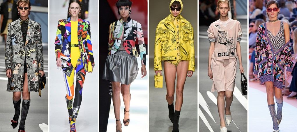 具有個性的漫畫與插畫圖像是2018春夏米蘭女裝的一大亮點,其中Prada更是一口氣與9位漫畫家聯手,推出一系列游移在漫畫的真實虛幻之間,天馬行空的圖像,甚至保留了漫畫格狀行走的結構;Missoni將普普風圖像表現在針織色塊變化,亦有漫畫貼網點的味道;Giorgio Armani則是以如海草圖案的分割圖像,表現藝術感的漫畫風味。