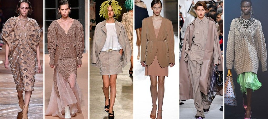 為了呼應懷舊本色,2018春夏還有許多中性色的出現,其中以暖棕色調可以讓整體的視覺效果更具舊時風貌。例如, Anrealage運用皺褶的份量與清透的鏤空面料,讓洋裝呈現俏皮的新調。Celine則以全件式的工裝搭配時尚的皮革披肩大衣,大面積的中性暖棕相近色層疊,透出另一番都會風貌。