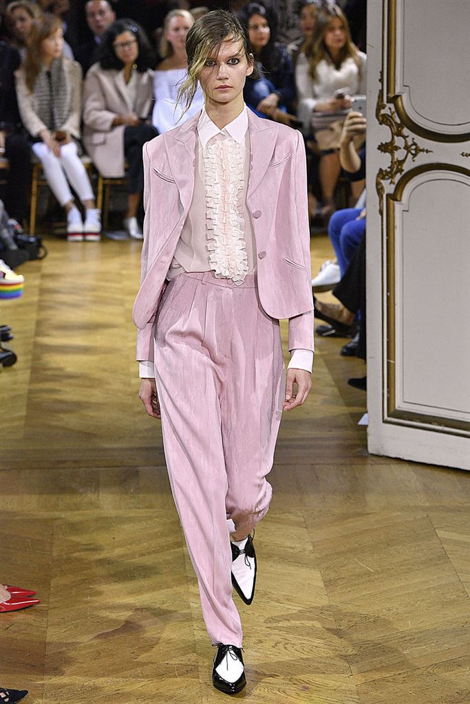 2018春夏色彩出現一新興粉彩紫色,讓整體的視覺效果有點舊時的風貌。例如,Veronique Leroy與Anrealage利用皺褶的份量感表現清透的紗質面料,Valentino以簡單的線條表現短版洋裝的俏麗與俐落。另外, John Galliano則以從頭到腳的粉紫套裝,讓軟調的粉紫色也能透過款式的詮釋表現強勢味道。