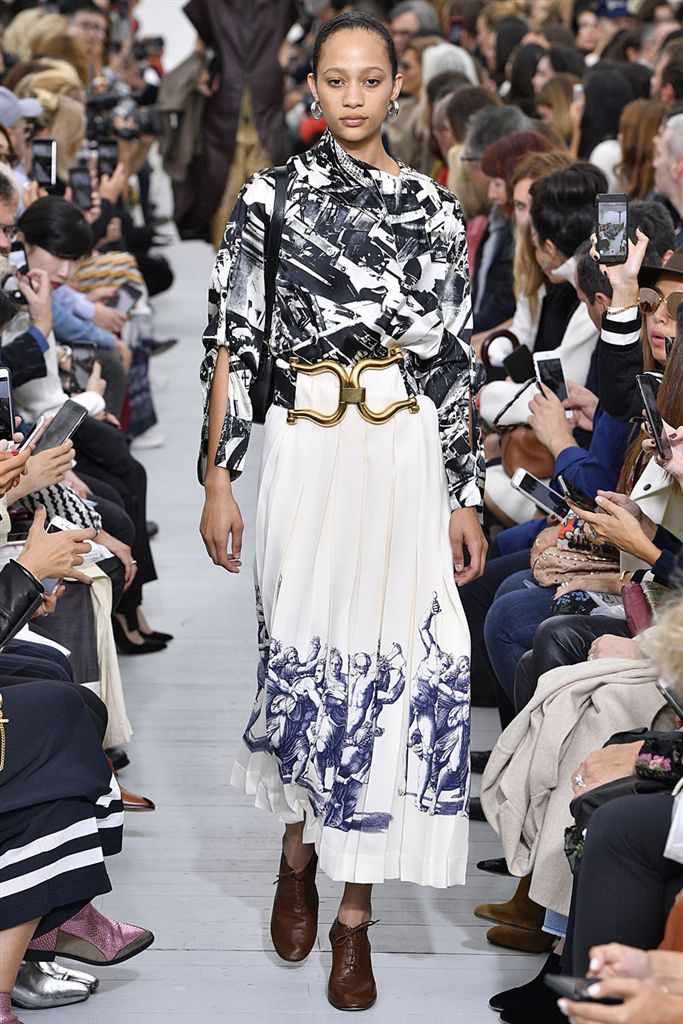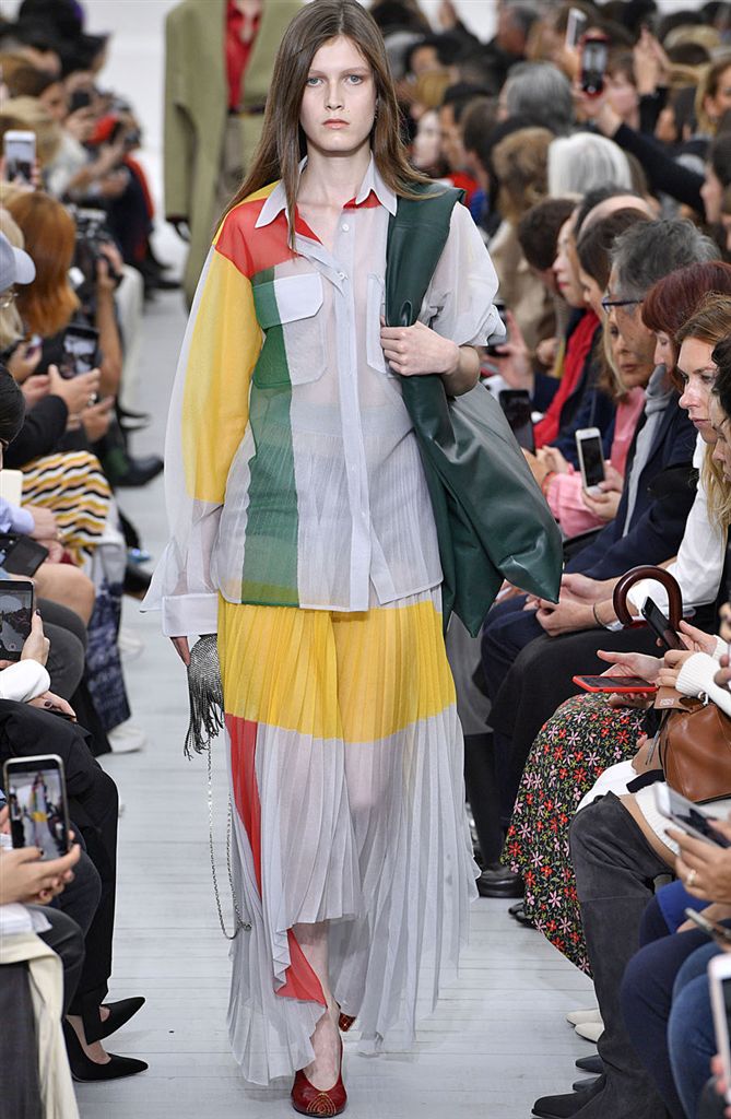 Celine設計師Phoebe Philo擅長針對摩登女性的現代生活提供別緻又自在的穿搭風格,2018春夏的靈感來自80年代,像是翻折挽接的兩層風衣、單側搭配百褶裙外穿的寬肩西裝,或是以超大西裝背心混搭加長碎花POLO衫與不對稱百褶裙,重新定義女性的西裝意涵