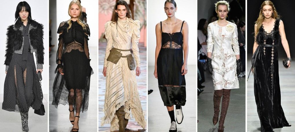 為呼應游牧主題的浪漫風格,蕾絲拼接為2018/19秋冬紐約秀場上的重要設計細節之一。不論是鏤空蕾絲的條紋鑲嵌,如Zimmermann、Brock、和Bottega Veneta,於單品的表面點綴出變化層次;或是局部挖空剪接蕾絲,如Michael Kors、Jonathan Simkhai、及Colovos,於裙襬開叉、肩部及腰部拼接運用,凸顯若隱若現的性感風情。