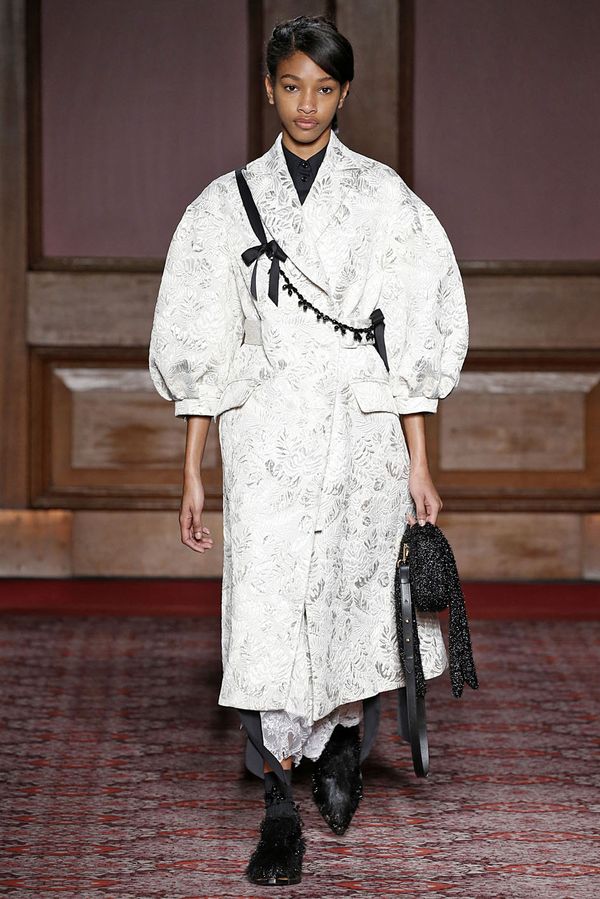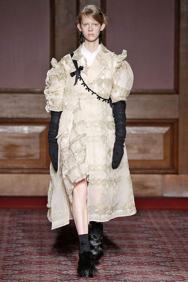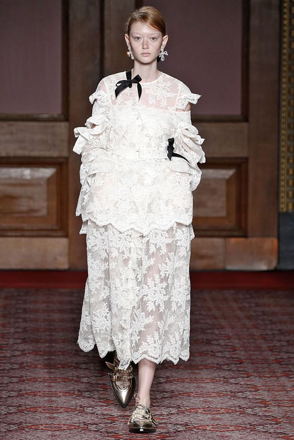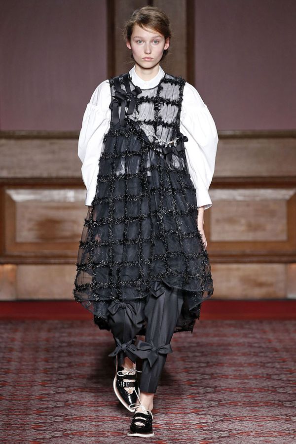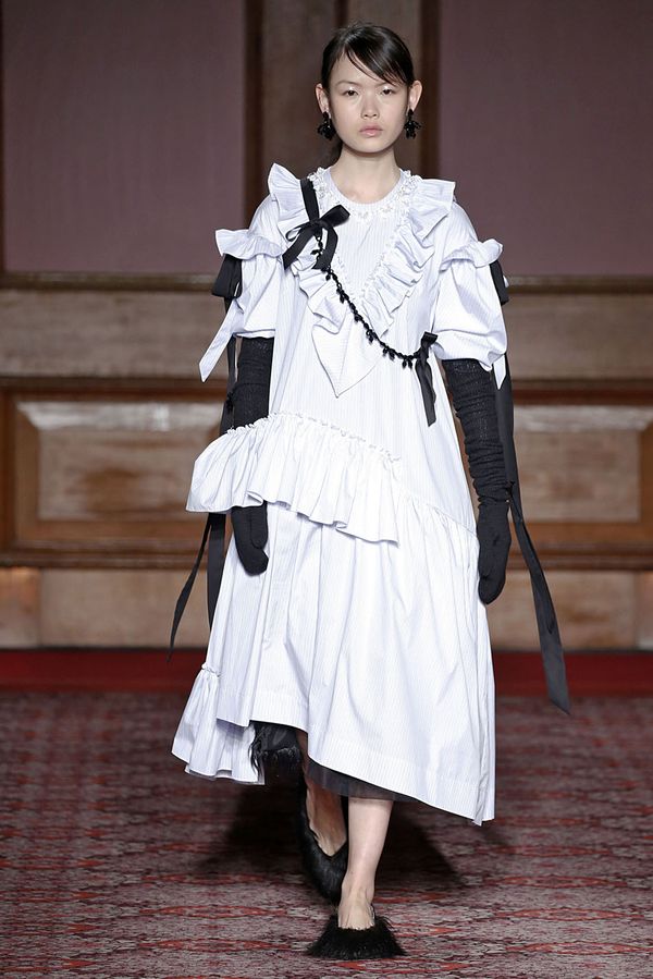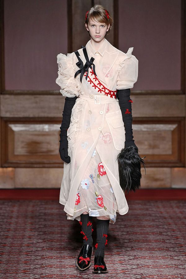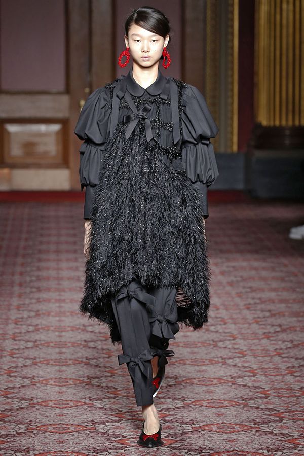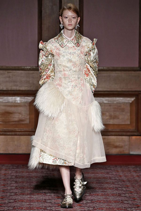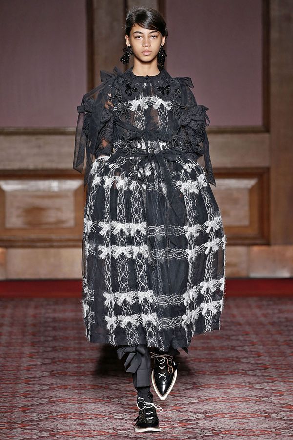 畢業自聖馬汀藝術學院的31歲愛爾蘭設計師Simone Rocha,總是以細膩的藝術觀點,將服裝解構再重組,2018/19秋冬Simone Rocha再次利用她最擅長的文藝古典畫布,同時加入龐克色彩。 Simone Rocha表示,2018/19秋冬的靈感源自1809年畫家John Constable繪製的Mary Freer與帝政時期的高腰輪廓與羊腿袖。「我想呈現豐富的質感與層次」,Simone Rocha在完整服裝結構之上覆蓋一層透視歐根紗,營造霧裡看花的感覺,或加入蝴蝶節、立體花形碎摺、珠繡織帶與拼接皮草,為服裝增添層次。 設計師擅長以現代手法扭曲男性、女性化與時代的界線:掛毯圖案的刺繡貼花,恰到好處的花卉與荷葉邊,綻放浪漫的詩意女性氣質。強化肩線的荷葉摺與蝴蝶結裝飾,龐克格紋與個性皮革、帝政少女與學院女孩,呈現柔美與強勢的撞擊。 最後配件部分,饒富玩味的皮草鞋和芭蕾舞鞋,讓人彷彿回到過去。