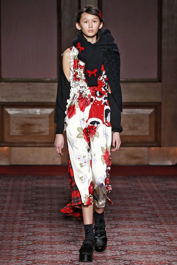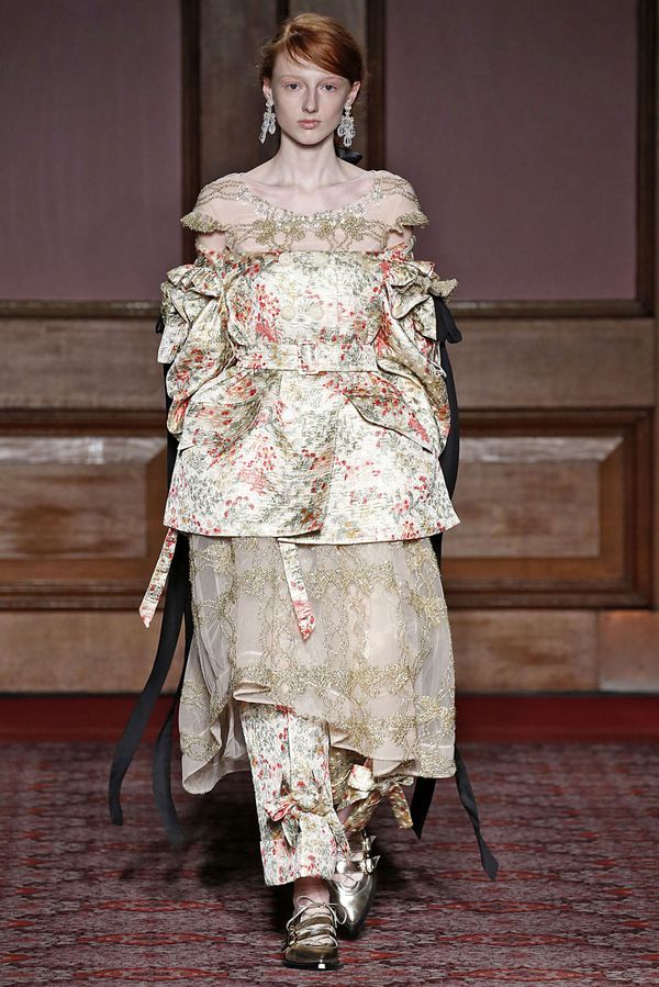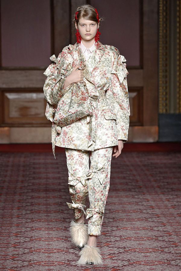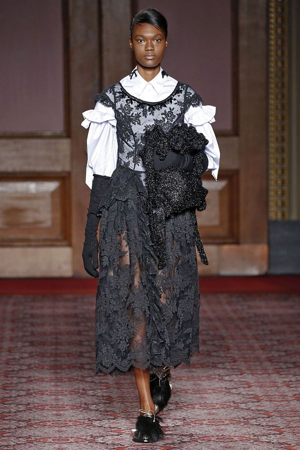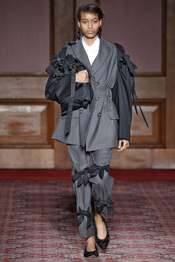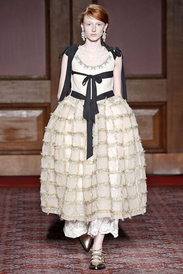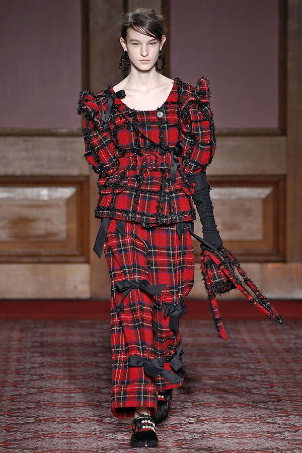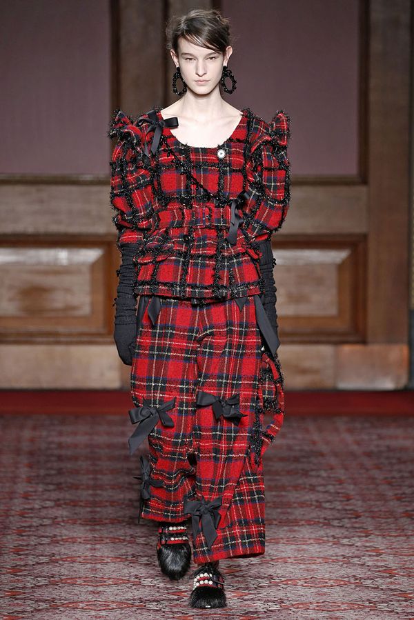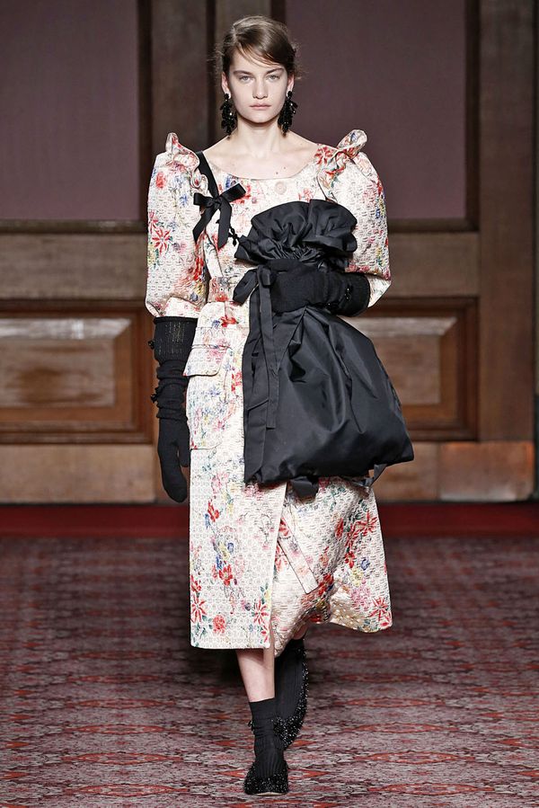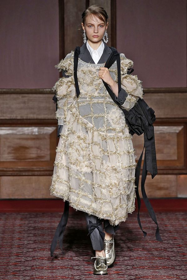畢業自聖馬汀藝術學院的31歲愛爾蘭設計師Simone Rocha,總是以細膩的藝術觀點,將服裝解構再重組,2018/19秋冬Simone Rocha再次利用她最擅長的文藝古典畫布,同時加入龐克色彩。 Simone Rocha表示,2018/19秋冬的靈感源自1809年畫家John Constable繪製的Mary Freer與帝政時期的高腰輪廓與羊腿袖。「我想呈現豐富的質感與層次」,Simone Rocha在完整服裝結構之上覆蓋一層透視歐根紗,營造霧裡看花的感覺,或加入蝴蝶節、立體花形碎摺、珠繡織帶與拼接皮草,為服裝增添層次。 設計師擅長以現代手法扭曲男性、女性化與時代的界線:掛毯圖案的刺繡貼花,恰到好處的花卉與荷葉邊,綻放浪漫的詩意女性氣質。強化肩線的荷葉摺與蝴蝶結裝飾,龐克格紋與個性皮革、帝政少女與學院女孩,呈現柔美與強勢的撞擊。 最後配件部分,饒富玩味的皮草鞋和芭蕾舞鞋,讓人彷彿回到過去。