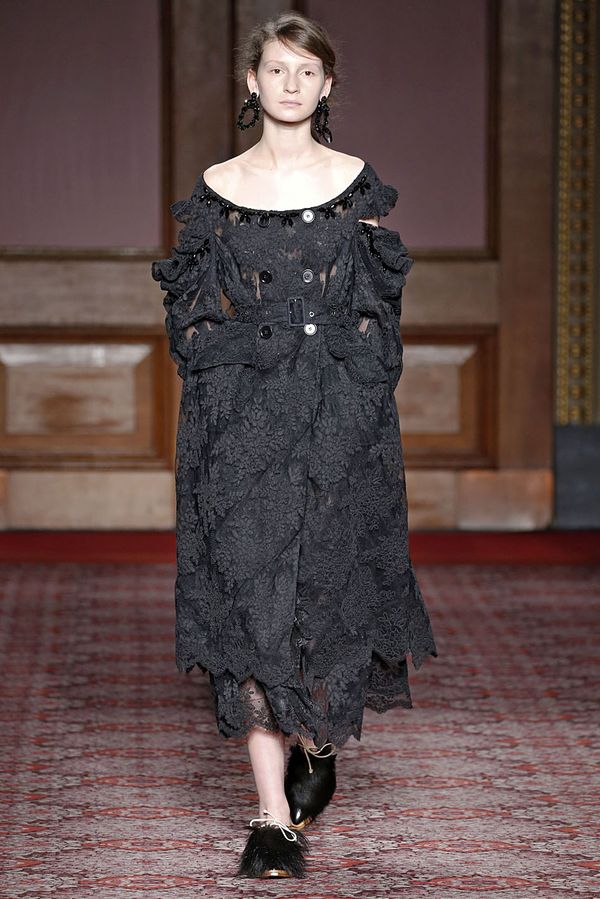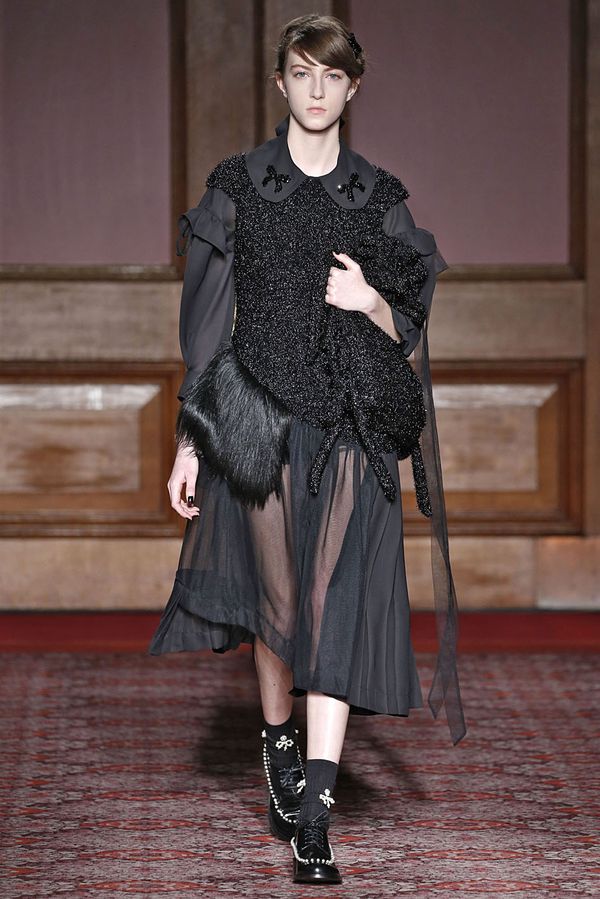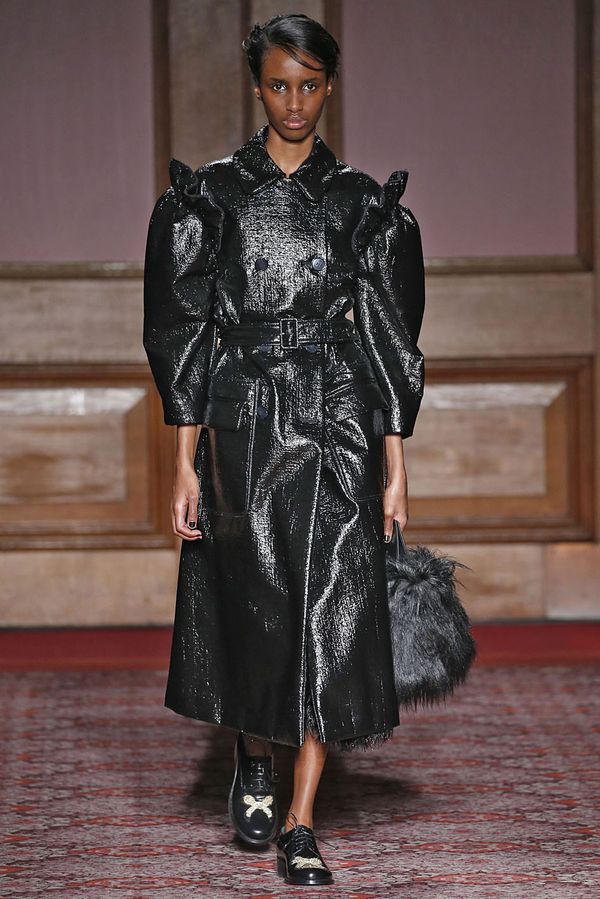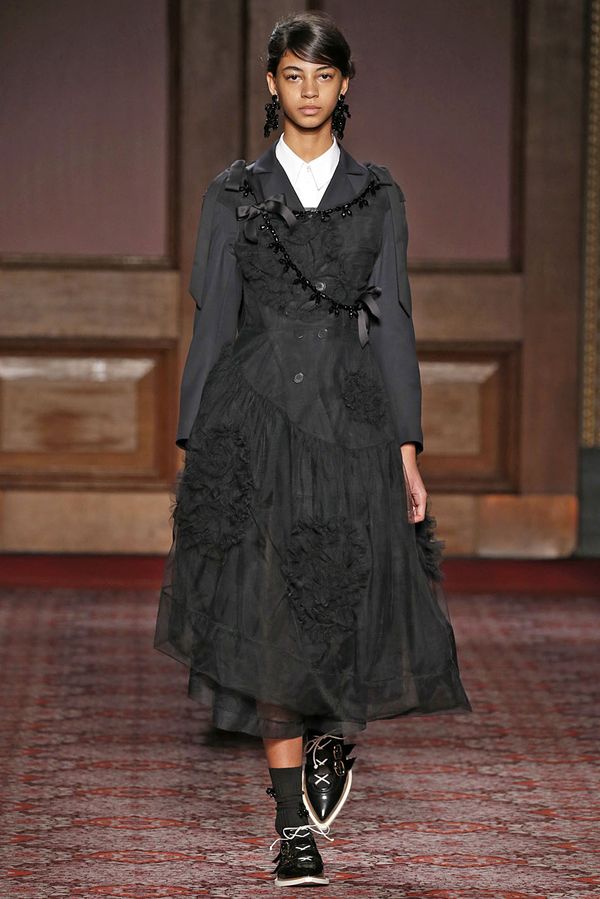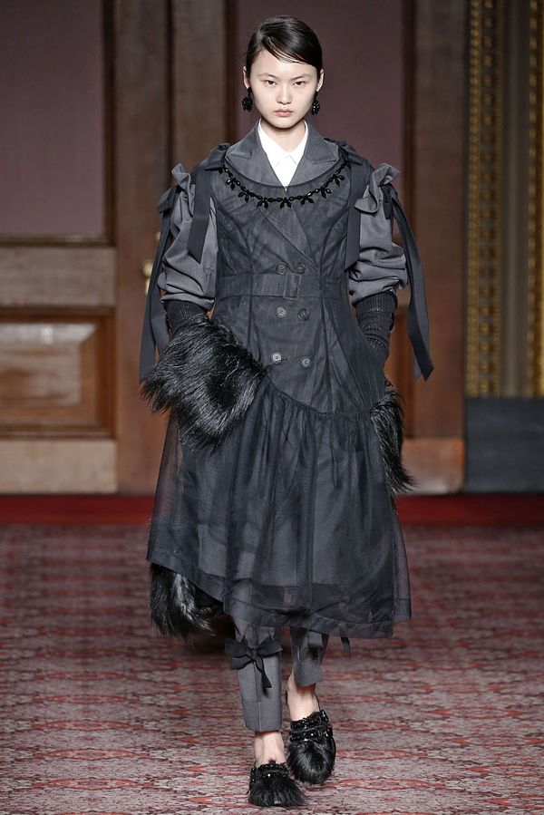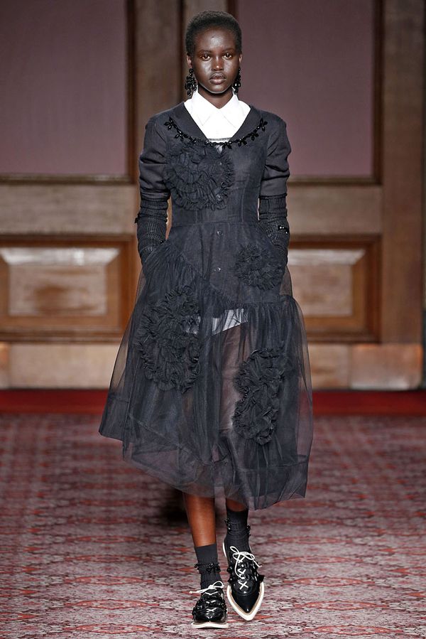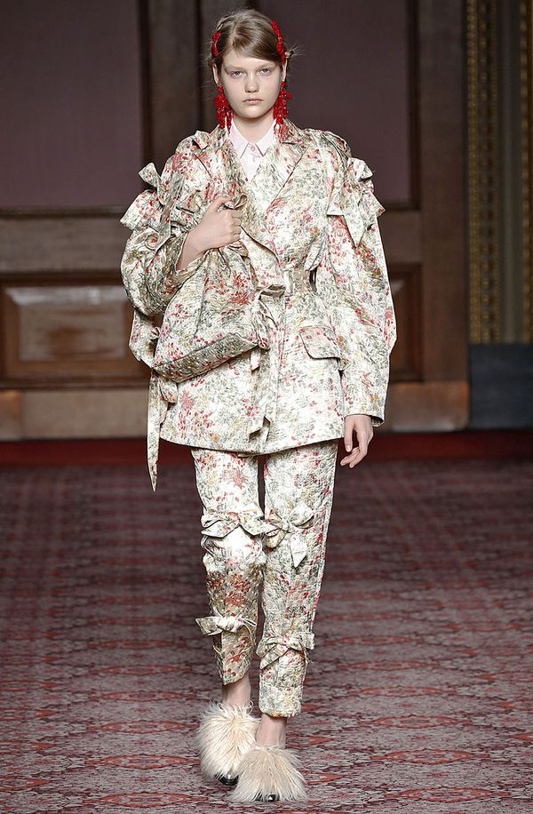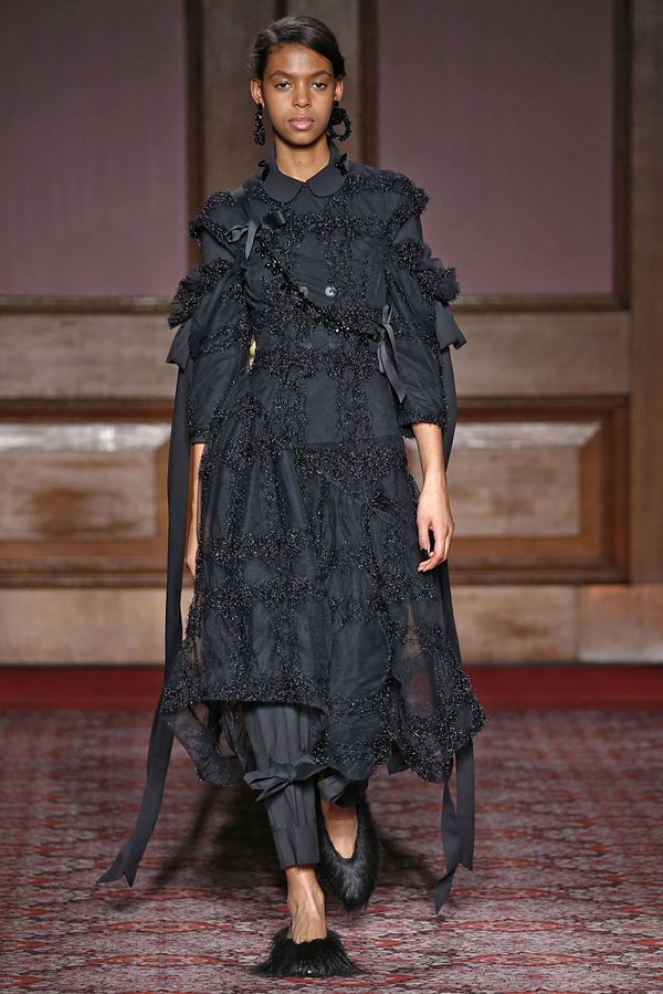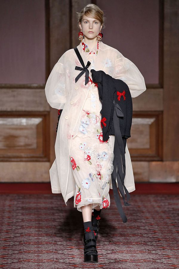畢業自聖馬汀藝術學院的31歲愛爾蘭設計師Simone Rocha,總是以細膩的藝術觀點,將服裝解構再重組,2018/19秋冬Simone Rocha再次利用她最擅長的文藝古典畫布,同時加入龐克色彩。 Simone Rocha表示,2018/19秋冬的靈感源自1809年畫家John Constable繪製的Mary Freer與帝政時期的高腰輪廓與羊腿袖。「我想呈現豐富的質感與層次」,Simone Rocha在完整服裝結構之上覆蓋一層透視歐根紗,營造霧裡看花的感覺,或加入蝴蝶節、立體花形碎摺、珠繡織帶與拼接皮草,為服裝增添層次。 設計師擅長以現代手法扭曲男性、女性化與時代的界線:掛毯圖案的刺繡貼花,恰到好處的花卉與荷葉邊,綻放浪漫的詩意女性氣質。強化肩線的荷葉摺與蝴蝶結裝飾,龐克格紋與個性皮革、帝政少女與學院女孩,呈現柔美與強勢的撞擊。 最後配件部分,饒富玩味的皮草鞋和芭蕾舞鞋,讓人彷彿回到過去。