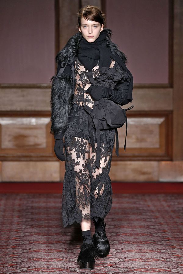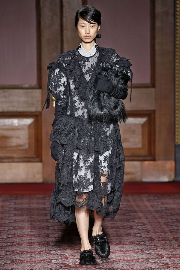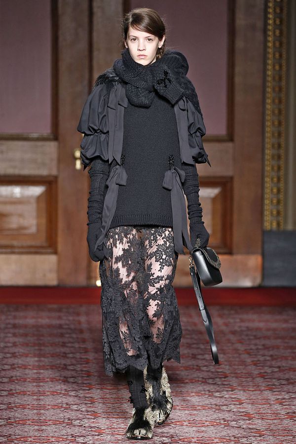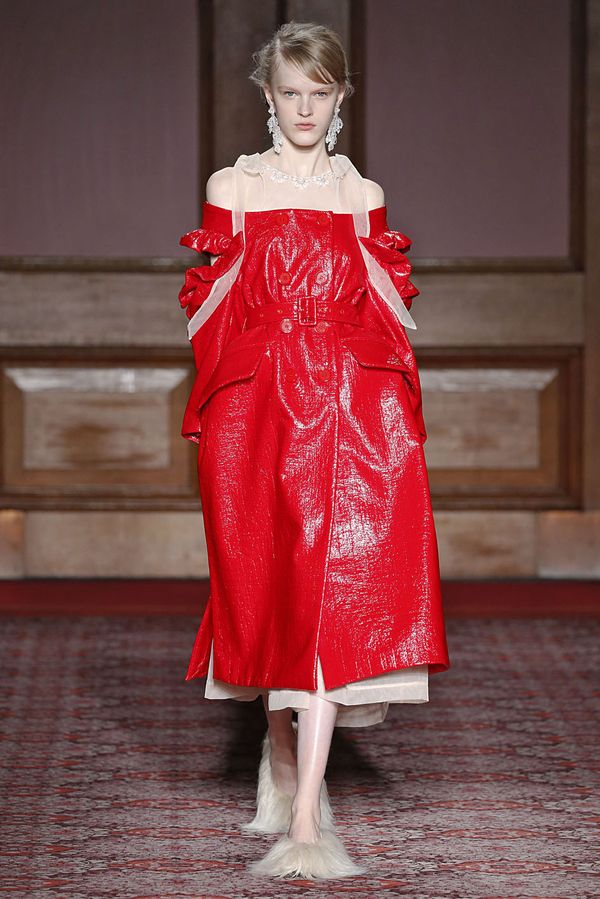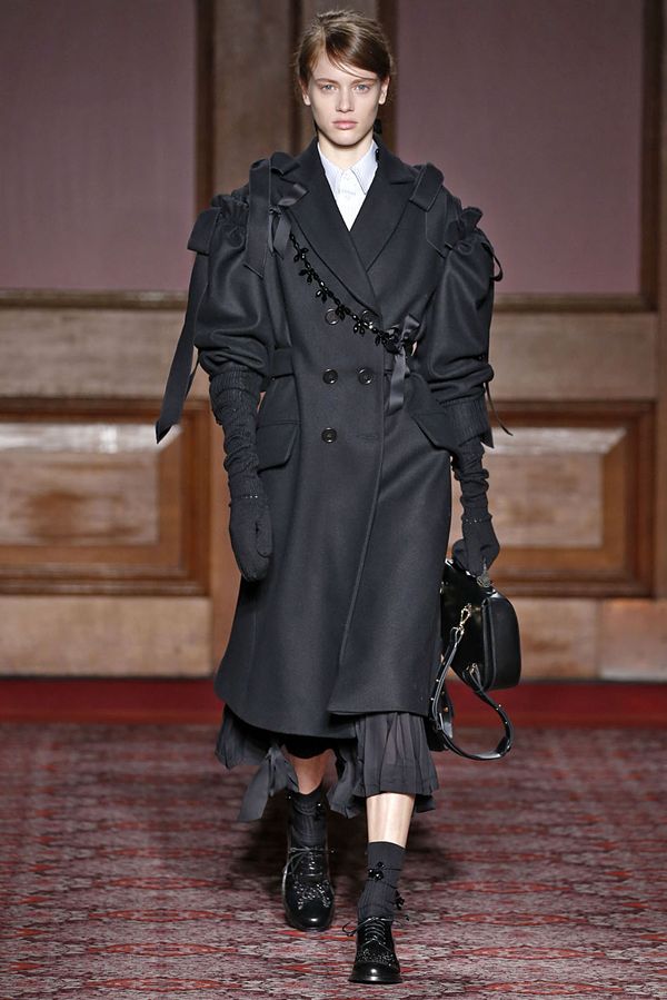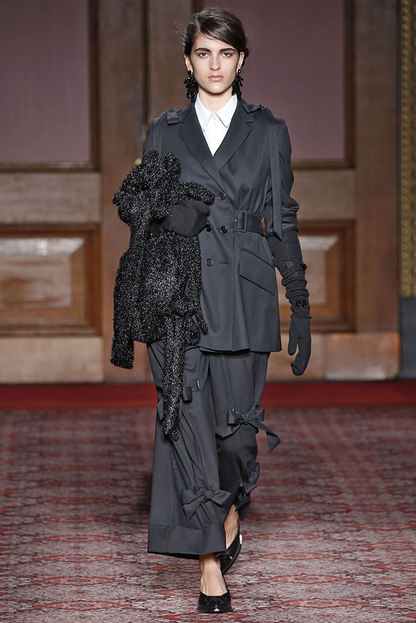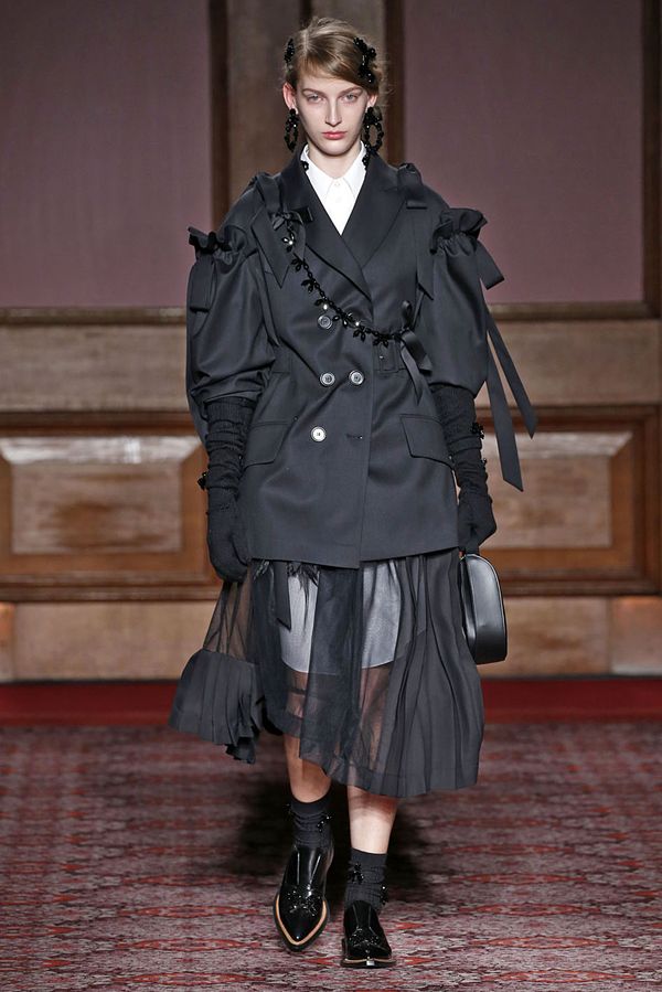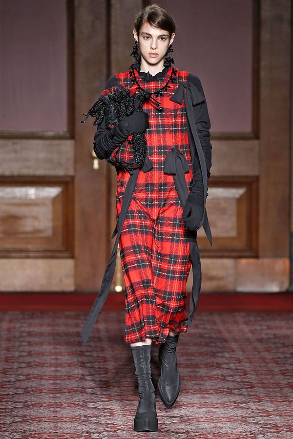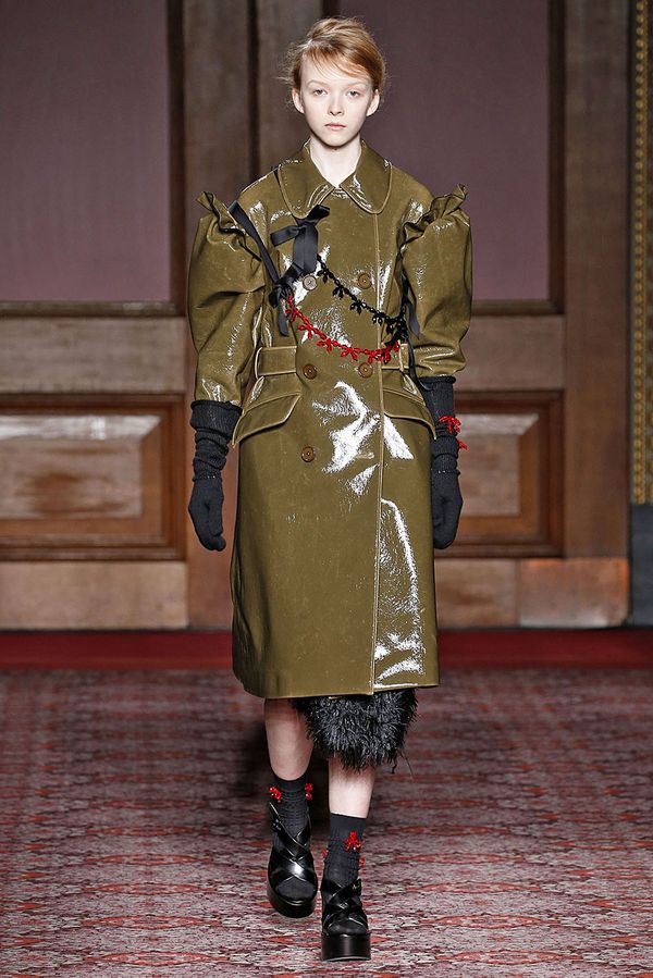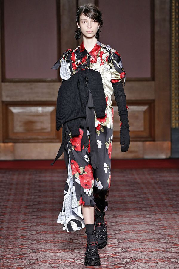 畢業自聖馬汀藝術學院的31歲愛爾蘭設計師Simone Rocha,總是以細膩的藝術觀點,將服裝解構再重組,2018/19秋冬Simone Rocha再次利用她最擅長的文藝古典畫布,同時加入龐克色彩。 Simone Rocha表示,2018/19秋冬的靈感源自1809年畫家John Constable繪製的Mary Freer與帝政時期的高腰輪廓與羊腿袖。「我想呈現豐富的質感與層次」,Simone Rocha在完整服裝結構之上覆蓋一層透視歐根紗,營造霧裡看花的感覺,或加入蝴蝶節、立體花形碎摺、珠繡織帶與拼接皮草,為服裝增添層次。 設計師擅長以現代手法扭曲男性、女性化與時代的界線:掛毯圖案的刺繡貼花,恰到好處的花卉與荷葉邊,綻放浪漫的詩意女性氣質。強化肩線的荷葉摺與蝴蝶結裝飾,龐克格紋與個性皮革、帝政少女與學院女孩,呈現柔美與強勢的撞擊。 最後配件部分,饒富玩味的皮草鞋和芭蕾舞鞋,讓人彷彿回到過去。