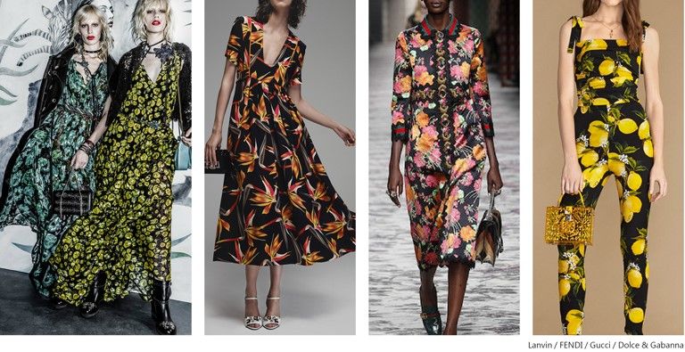 這類印花風格十分多變,絢爛奪目的大面積花朵圖案,充滿濃郁果香的檸檬,遍滿大地搖曳散落的花朵,亦或是熱情奔放的南非天堂鳥作為主角,好似繁花在夜間盛開的霓虹都會榮景。