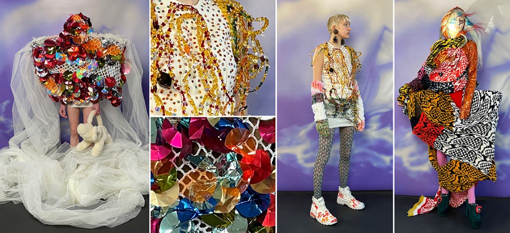 超大浮誇系的永續亮片,搭配手工編織的各種圖紋與魚網結構,完全打破傳統對服裝輪廓的想像。
