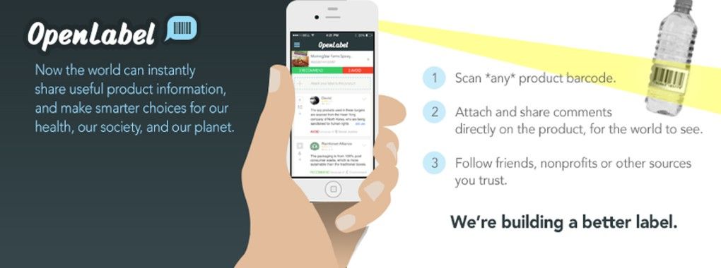 OpenLabel是一個免費網站與APP,創辦人Scott Kennedy蒐集產品的成分與製程資訊,並在每個產品上放置一組條碼,消費者只要掃描條碼即可搜索產品,立即查閱產品訊息以及相關使用者分享經驗。