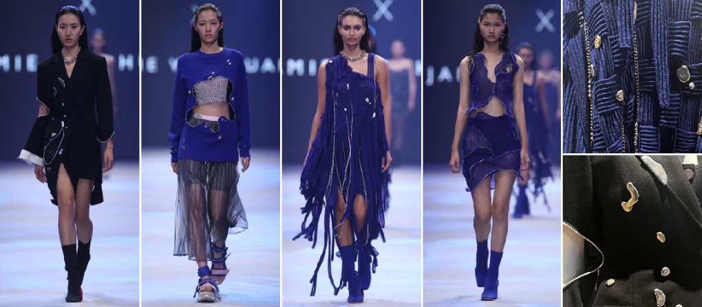 第2部分以石洗丹寧布為主要素材,以礦石般的質地打造立體造型服裝。
