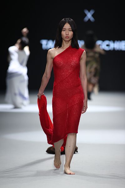 全系列由循序漸進,在配色上由天然的竹色到黑色,面料從輕薄到厚重,設計也從局部的竹編細節輔料,一直擴展為衝破服裝結構的「雲煙」,呈現布料與竹材兩種不同媒材之間的可塑性。