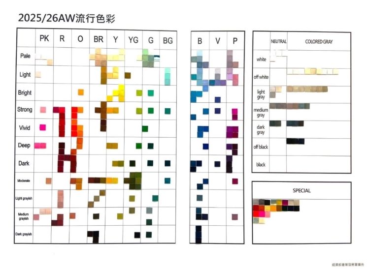 2025/26秋冬色彩從生物世界中汲取靈感,提醒我們生物是創造的起源;現實和虛擬都想要快速發展的前提下,更應該調整生產時間,符合生物界的節奏發展。綠色(G)的大幅上升催促著保護生態刻不容緩;藍紫色(V)和紫色(P)的上升,呈現出虛擬美學的奇幻視角,科技發展與生態保護需要達成和諧;桔色(O)的大幅上升,蘊含對於地球環境沸騰的憤怒和警示,和立即採取行動的強烈訴求。