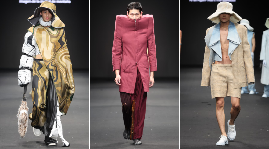 (左) 郭杰鑫「山城意象imagen de la ciudad de montaña」以台灣的地形等高線做設計融合發想,搭配大地色和白底黑線組成的等高線印花傳達台灣之美。(中)張書偉「信條 TENET」結合三個哲學物理: 薩托方陣、永恆回歸、塊狀宇宙理論,傳達生命早已注定會無窮無境的不斷循環延伸。(右)陳宣宇「To Be Again That's The Question」,對現如今飛快發展的資訊科技進行反思,認為許多事物逐漸變得夢幻不可及,唯有放慢速度、掌握已知,才是將自己置於清醒的不二之道。