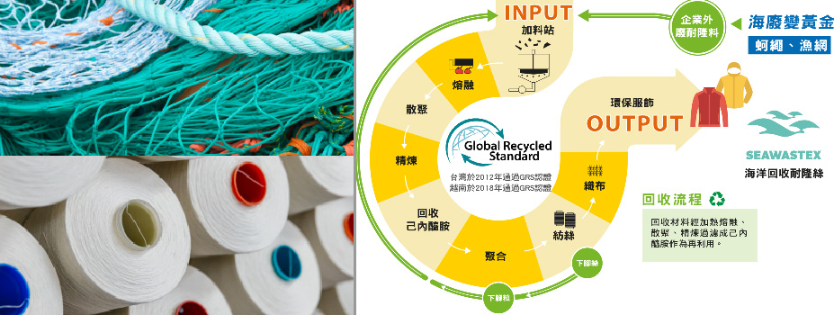 台灣化學纖維公司運用化學法散聚回收技術,將可將回收的漁網與漁具,以及工廠的下腳料等還原為主要單體—己內醯胺(CPL),再通過開環、聚合反應製成全新的尼龍材料。