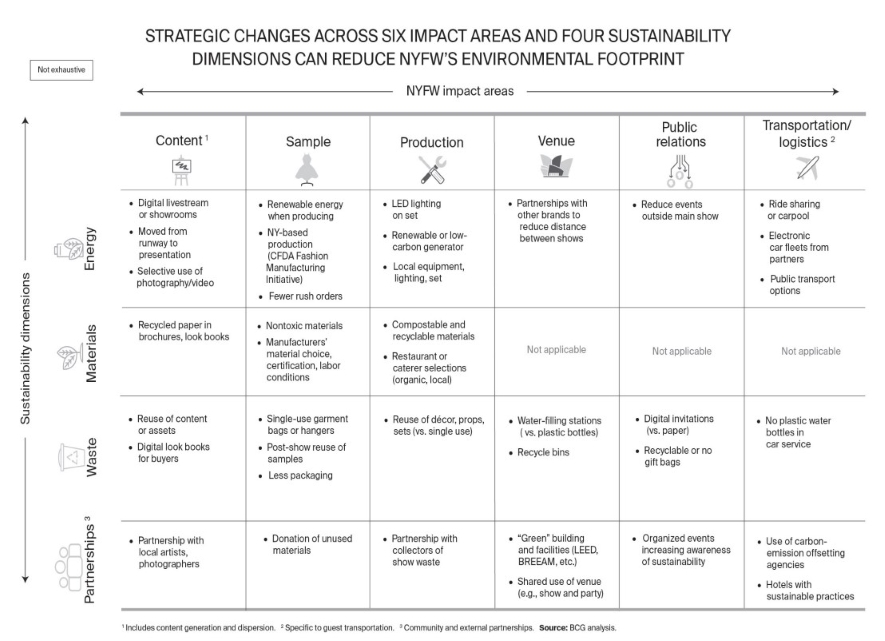 指南進一步從內容、樣品、製作、展演場地、公關與運輸6大面向提出具體建議,並根據能源(energy)、材料(materials)、減廢 (waste)與夥伴關係(partnership)等四個維度加以分類,提供紐約時裝週相關的人員(中小品牌及設計師、公關機構、製作公司、活動策畫等)實務導引。CFDA也在多數的建議項目中給予實際的支援,例如協助媒合合作夥伴、提供倉儲資源及製作資源等。