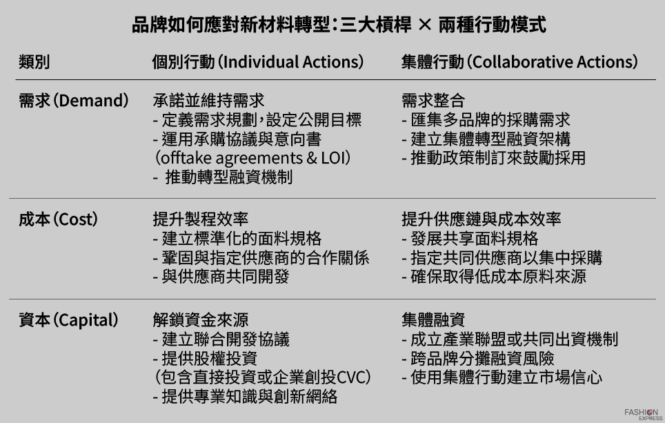 新世代材料已非可選項目,而是品牌面對環境挑戰與市場競爭的策略性必然選擇。品牌應立即行動,透過整合需求、成本及資本槓桿,加速新世代材料的普及,從而在未來的市場競爭中取得顯著優勢。