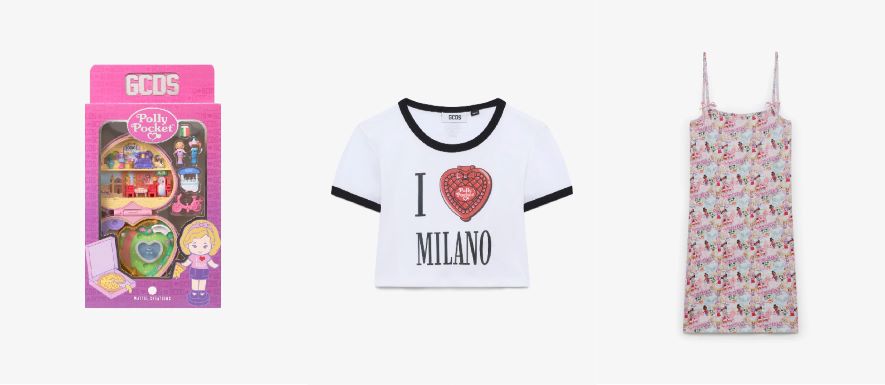GCDS 聯合創始人兼創意總監 Giuliano Calza 與美泰 (Mattel Inc.) 聯手打造了獨一無二的Polly Pocket玩具套裝,同時發售的有主題成衣膠囊系列,包括印有Polly Pocket圖案的T恤和細肩帶洋裝等等。這場前衛的合作將GCD奢華的時尚世界與Polly Pocket色彩繽紛的微型模型巧妙融合。