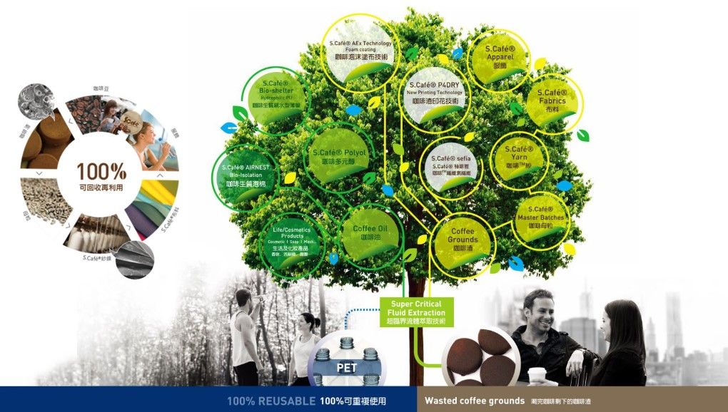 其中,S.Cafe®環保科技咖啡紗係將奈米級的咖啡渣加進回收PET塑膠母粒抽絲成紗,大約三杯咖啡的咖啡渣就能製成一件衣服。而且添加了奈米咖啡渣後的S.Café®紗線,因為咖啡渣增加表面積與渣上的微小孔洞,而展現出優異的水份擴散速乾能力、異味吸附控制與折射紫外線等特性,不少廠商將之製成機能大衣、西裝外套、貼身衣物。