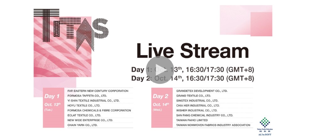 包括15超過40個國際品牌,如德國戶外運動品牌Vaude、英國旅遊探險服裝品牌Craghoppers、美國戶外休閒品牌Royal Robbins、日本運動用品品牌Mizuno等,與參展商進行超過300場一對一的視訊及實體採購洽談會;另為推廣台灣紡織業整體形象及我業者新開發的紡織品,彌補國外品牌買主無法親自到訪的缺憾,TITAS也邀請具研發新產品能力的16家參展商以全英文錄製直播影片介紹精華展品,於展覽期間上架Youtube、FB等影音頻道及網站,邀請國際買主上網觀看,以促進商機。