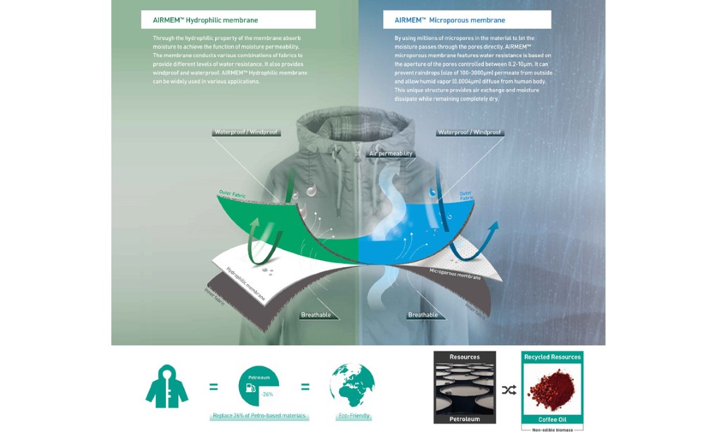 興采的環保咖啡生質薄膜 AIRMEN™薄膜,較一般市面上PU膜增加了兩倍以上的異味控制,並減少26%石油使用量。在2020年TITAS展,興采集團更帶來環保升級的AIRMEM™-X,將回收工業廢料加上非糧源生質咖啡油,共可取代46%石油使用;另AIRMRM COLORSHELL色膜系列搭配solution dyed面料,不僅提供多種顏色選擇,也節省染整用水。