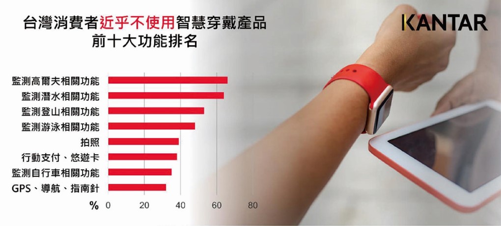 比較而言,特定運動的監測功能像是高爾夫、潛水、登山、游泳等使用率仍相當低,需求不大。而許 多智慧型手錶/手環配有的拍照、電子支付方式、GPS 導航等功能的使用頻率也不高,可以想見大多數人仍然習慣以手機操作這些功能,或者還不熟悉以智慧手錶/手環替代。