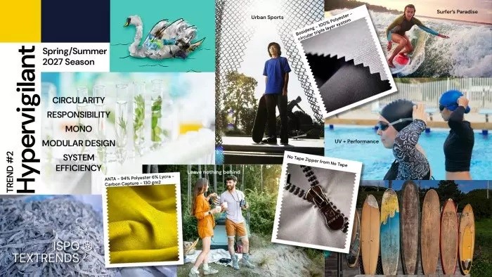 - 趨勢氛圍:以「物盡其用,不浪費」為原則,驅動著對循環性的高度警覺,強調對海洋廢棄物等合成材料和農業/食品產業廢棄物的利用。負責任的設計是關鍵,要求在產品開始前就考慮報廢選項。產業正使用可生物降解的化學品以加速減少微纖維污染問題。目標是零浪費,並通過原液染色等工藝減少水和能源的消耗。