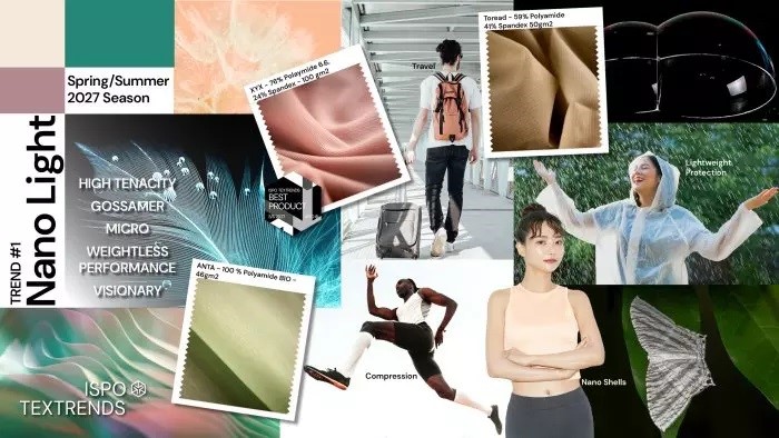 - 趨勢氛圍:這個趨勢是工程和設計的奇蹟,對大自然表達敬意,在幾乎不存在的基材上提供機能和保護,外殼重量不到100g/m2。核心功能為可收納性、抗紫外線、涼感觸摸、抗臭、快乾和濕氣管理等夏季必備功能。這是一種永續創新,擁抱仿生學,通過紗線處理模仿大自然表面的疏水性,並使用生物基 DWR。面料經過工程設計以減少最終產品的組件數量,實現輕量化、永續性和耐用性的結合。